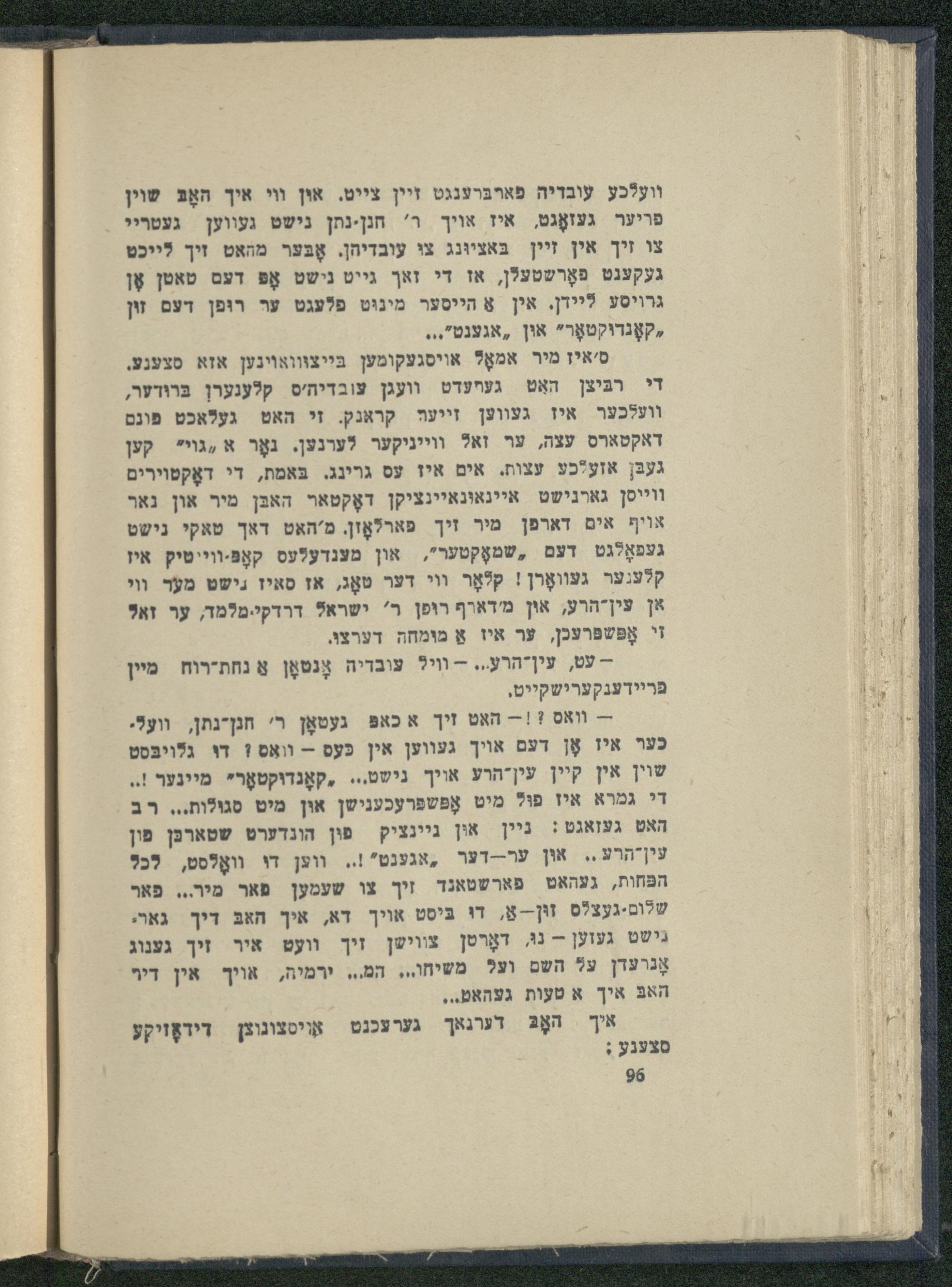 - ואס?!- האט זיך א כאפּ געטאָן ר' חנן-נתן, וועל. כער איז אָן דעם אויך געווען אין כּעס- וואס! דו גלױבּסט שוין אין קיין עיןהרע אויך נישט... ,קאָנדוקטאָר" מיינער!.. די גמרא איז פיל מיט אָפּשפּרעכענישן און מיט סגולות... רב האט געזאגט: ניין אוּן גיינציק פון הונדערט שטארכן פון עיןהרע.. אוּן ער--דער;אגענט"!.. ווען דו װאָלסט, לכל הפּחות, געהאט פארשטאנד זיך צו שעמען פאר מיר... פאר שלום-געצלס זוּן--אַ, דוּ בּיסט אויך דא, איך האבּ דיך גארו. נישט געזען= נוּ, דאָרטן צווישן זיך וועט איר זיך גענוג אָנרעדן על השם ועל משיחו,.. המ... ירמיה, אויך אין דיף האבּ איך א טעות געהאט...