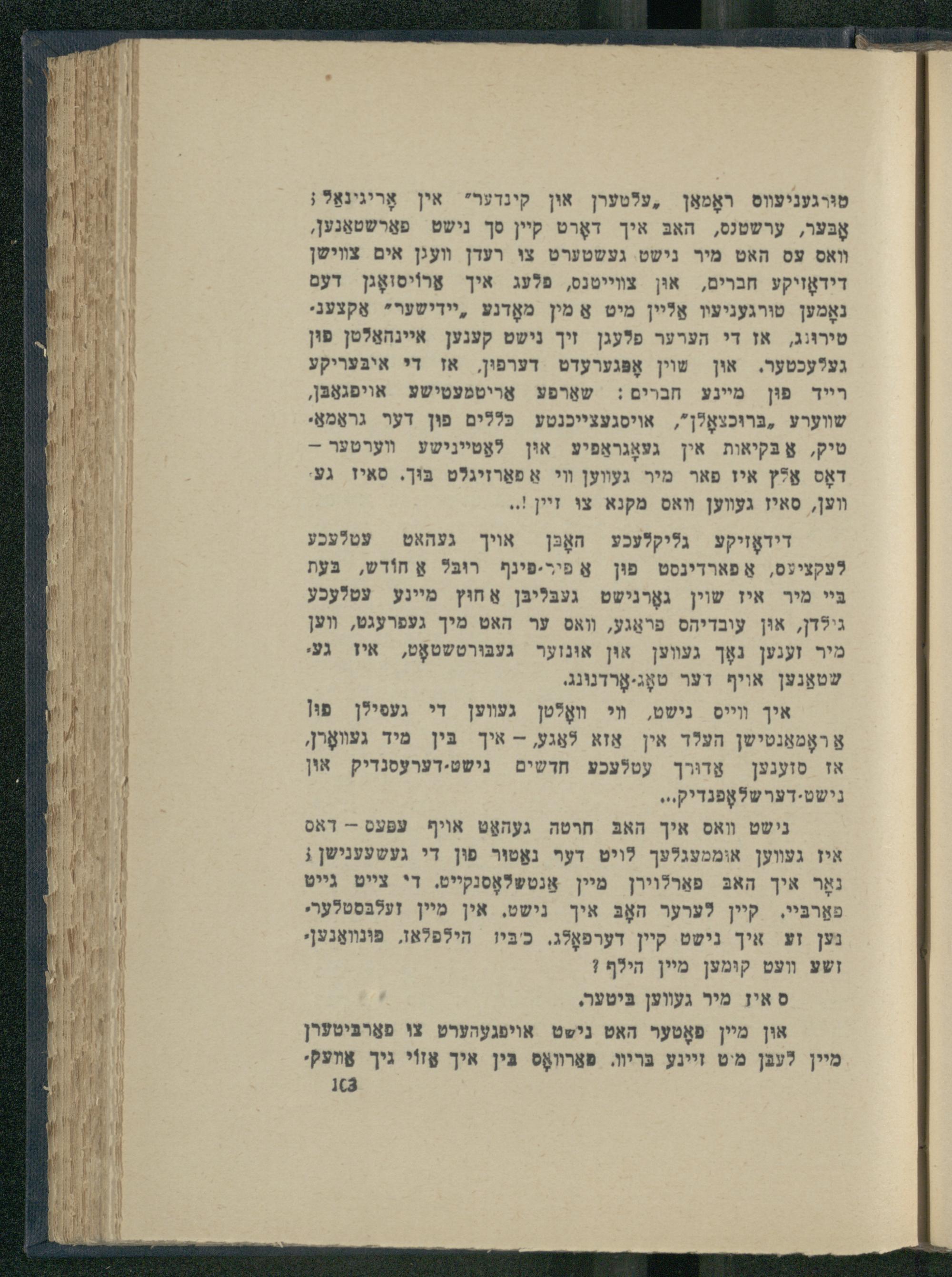 טורגעניעווס ראָמאַן ,עלטערן און קינדער" אין אָריגינאַל{ אָבּער, ערשט(ס, האבּ איך דאָרט קיין סך נישט פאַרשטאַנען, וואס עס האט מיר נישט געשטערט צוּ רעדן װעגן אים צווישן דידאָזיקע חברים, און צווייטנס, פלעג איך אַרוֹיסואָגן דעם נאָמען טורגעניעון אַליין מיט אַ מין מאָדנע ,יידישער* אַקצעני טירוױנג, אז די הערער פלעגן זיך נישט קענען איינהאַלטן פוּן געלעכטער. און שוין אָפּגערעדט דערפון, אז די איבּעריקע ריד פוּן מיינע חברים: שאַרפע אַריטמעטישע אויפגאַבּן, שווערע ,בּרוּכצאָלן", אויסגעצייכנטע כּללים פון דער גראַמאַי טיק, אַ בּקיאות אין גצאָגראַפיע אין לאַטײנישע װערטער דאָס אַלֹץ איז פאר מיר געווען װי אַ פאַרזיגלט בּוּךְ. סאיז געי ווען, סאיז געווען ואס מקנא צו זיין!..