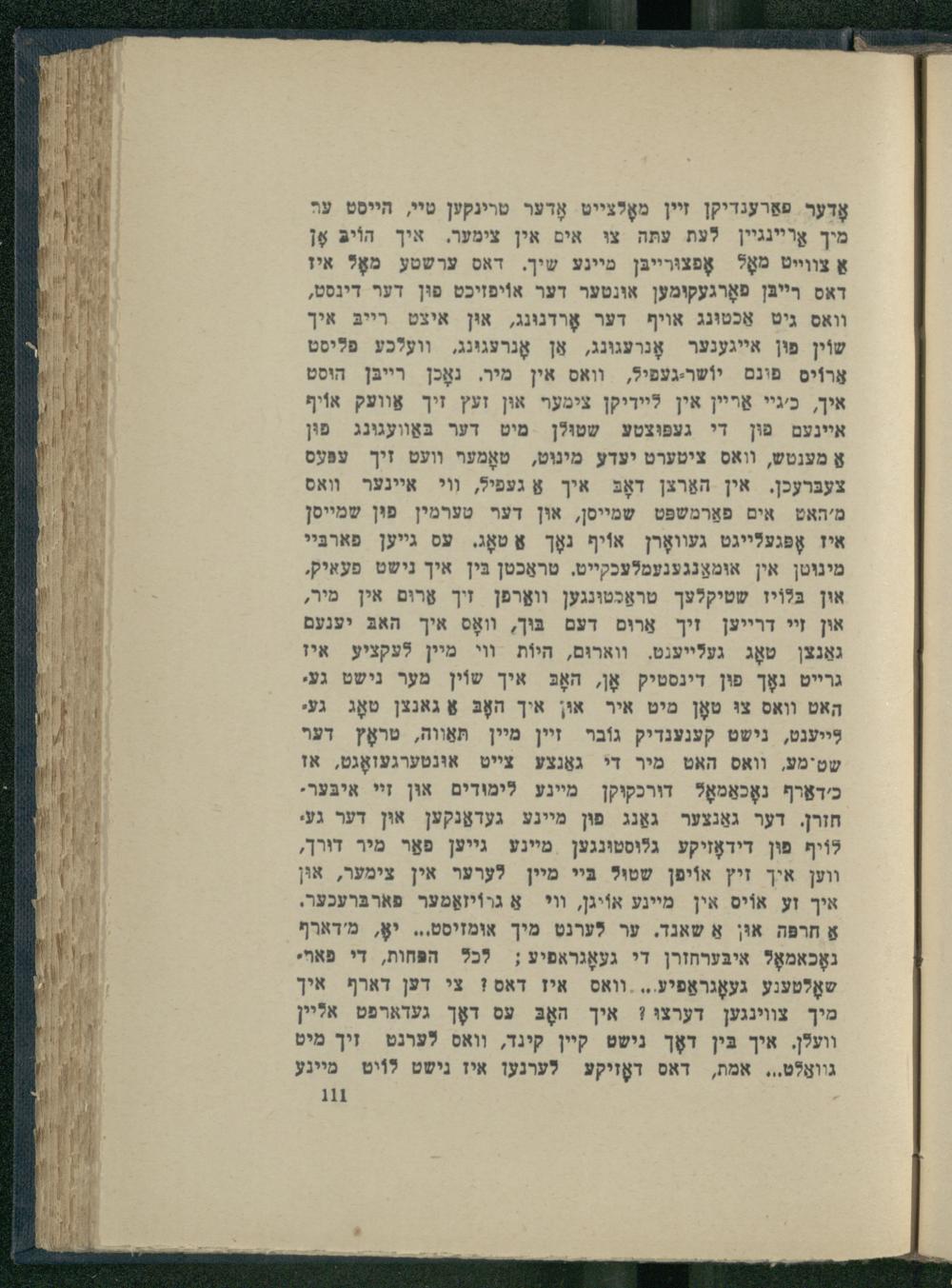 אָדער פאַרענדיקן זיין מאָלצייט אָדער טרינקען טיי, הייסט ער מיך אַױיינגײן לעת עתּה צי אים אין צימער. איך הוֹיבּ אָן אַ צווייט מאָל אָפצוּרייבּן מיינע שיך. דאס ערשטע מאָל איז דאס רייבּן פאָרגעקומען אונטער דער אוֹיפּזיכט פוּן דער דינסט, וואס גיט אַכטוּנג אויף דער אָרדנוּנג, און איצט רייבּ איך שוֹין פוּן אייגענער אָנרעגוּנג, אַן אָנרעגונג, וועלכע פליסט אַרוֹים פוּנם יוֹשר-געפיל, וואס אין מיר. נאָכן רײבּן היסט איך, כ'גיי אַריין אין ליידיקן צימער אוּן זעץ זיך אַװועק אוֹיף איינעם פֿוּן די געפּוּצטע שטוּלן מיט דער בּאַװעגונג פוּן אַ מענטש, וואס ציטערט יעדע מינוּט, טאָמעף װעט זיך עפּעס צעבּרעכן. אין האַרצן דאָבּ איך אַ געפיל, וִוֹי איינער ואס מ'האט אים פאַרמשפּט שמייסן, און דער טערמין פוּן שמייסן איז אָפּגעלײגט געוואָרן אוֹיף נאָך אַ טאָג. עס גייען פארבּיי מינוּטן אין אוּמאַנגענעמלעכקייט. טראַכטן בִּין איך נישט פעאיק, אוּן בּלוֹיו שטיקלעך טראַכטוּנגען וואַרפן זיך אַרוּם אין מיר, און זי דרייען זיך אַרוּם דעם בּוּך, װאָס איך האבּ יענעם גאַנצן טאָג געלייענט. ווארוּם, היוֹת וי מיין לעקציע איז גרייט נאָך פוּן דינסטיק אָן, האָבּ איך שוֹין מער נישט געי האט וואס צוּ טאָן מיט איר און איך האָבּ אַ גאנצן טאָג געי לייענט, נישט קענענדיק גוֹבר זיין מיין תּאַווה, טראָץ דער שטימע, וואס האט מיר די גאַנצע צייט אוּנטערגעואָגט, אז כ'דאַרף נאָכאַמאָל דורכקוקן מיינע לימוּדים אוּן זײ איבּער. חזרן. דער גאַנצער גאַנג פוּן מיינע געדאַנקען און דער געי לוֹיף פוּן דידאָזיקע גלוסטוּנגען מיינע גייען פאַר מיר דורך, ווען איך זיץ אוֹיפן שטו? בּיי מיין לערער אין צימער, אוּן איך זע אוֹיס אין מיינע אוֹיגן, וי אַ גרוֹיזאַמער פארבּרעכער, אַ חרפּה אוּן אַ שאנד. ער לערנט מיך אומזיסט... יאָ, מ'דארף נאָכאמאָל איבּערחזרן די געאָגראפיע; 7כל הפחות, די פאתי שאָלטענע געאָגראַפיע....וואס איז דאס! צי דען דארף איך מיך צווינגען דערצוּ? איך האָבּ עס דאָך געדארפט אליין וועלן. איך בִּין דאָך נישט קיין קינד, וואס לערנט זיך מיט גװאַלט... אמת, דאס דאָזיקע לערנען איז נישט לוֹיט מיינע 11