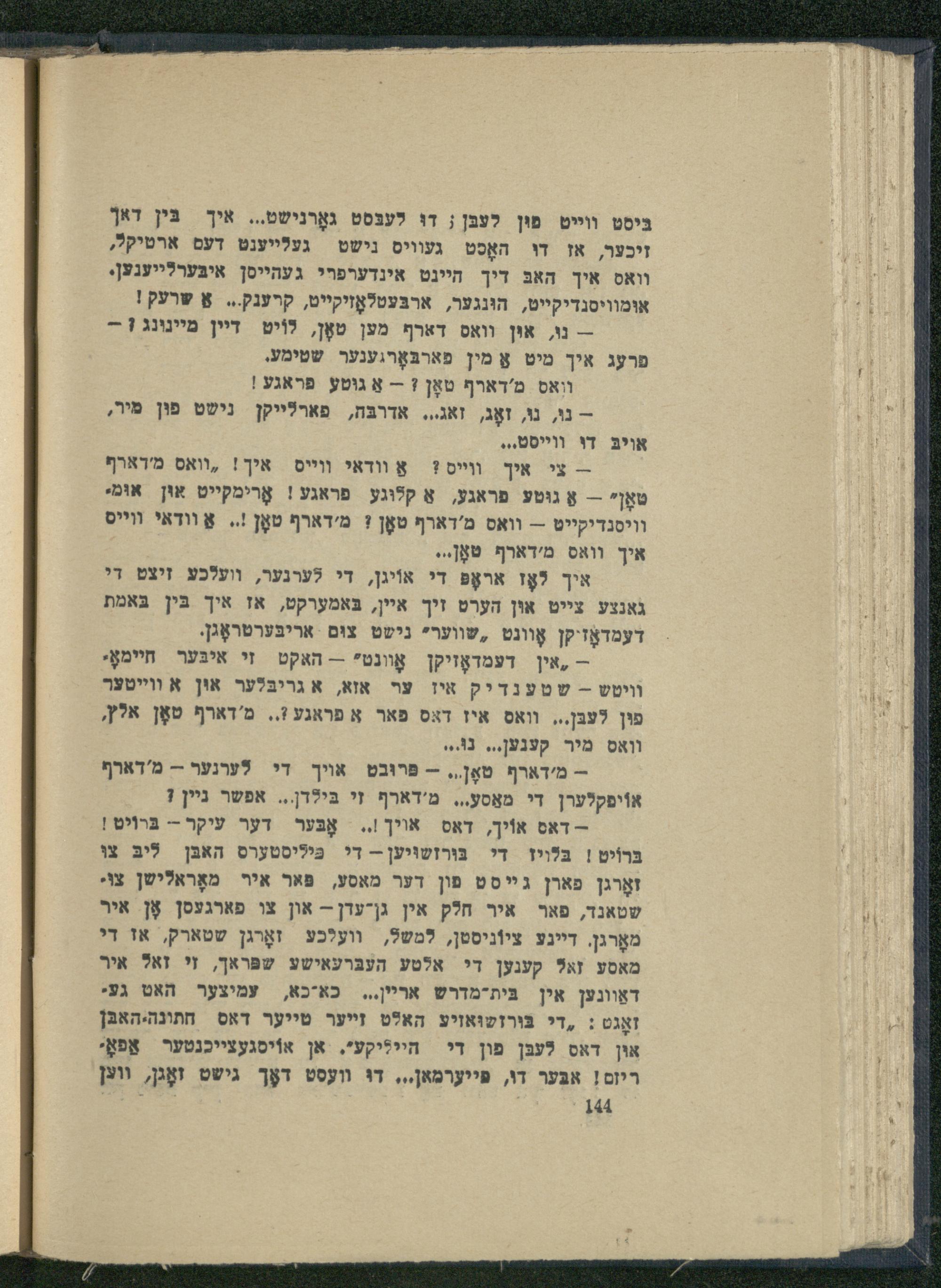 - דאס אוֹיך, דאס אוין!.. אָבֶּער דער עיקר-- בּרוֹיט! בּרוֹיט{ בּלױז די בּורזשויען-- די כּיליסטערס האבן ליב צוּ זאָרגן פארן גײ סט פון דער מאסע, פאר איר מאָראלישן צוֹי שטאנד, פאר איר חלק אין ג|-עדן-- און צו פארגעסן אָן איר מאָרגן. דיינע ציוֹניסטן, למשל, וועלכע זאָרגן שטארק, או די מאסע זא? קענען די אלטע העבּרעאישע שפּראך, זי זאל איר דאַוונען אין בּית-מדרש אריין... כאיכא, עמיצער האט געי זאָגט: ,די בּורזטוּאזיע האלט זײער טייער דאס חתונה.האבן אוּן דאס לעבּן פון די הייליקע". אן אוֹיסגעצייכנטער אַפאָ: ריזם! אבּער דו, פייערמאן.., דוּ װעסט דאָך גישט זאָגן, ווען