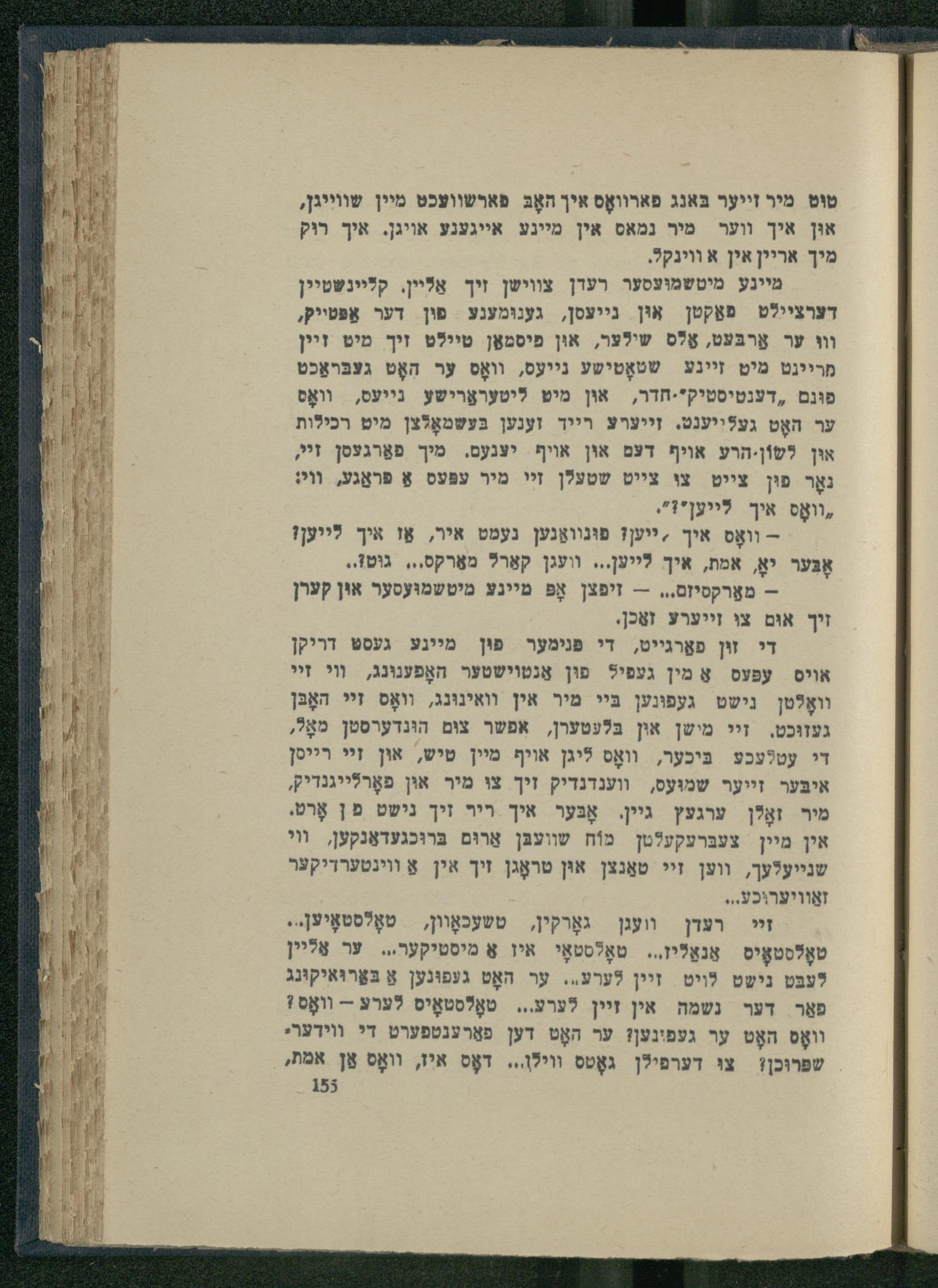 זײ רעדן וועגן גאָרקין, טשעכאָוון, טאָלסטאָיען.. טאָלסטאָיס אַנאַלין,.. טאָלסטאָי איו אַ מיסטיקער... ער אַליין לֶעבּט נישט לויט זיין לערע.. ער האָט געפוּנען אַ בּאַרוּאיקוּנג פאַר דער נשמה אין זיין לערע... טאָלסטאָיס לערע-- װאָס! וװאָס האָט ער געפינען? ער האָט דען פאַרענטפערט די ווידערי שפּרוּכן? צוּ דערפילן גאָטס ווילן.. דאָס איז, וװאָס אַן אמת,