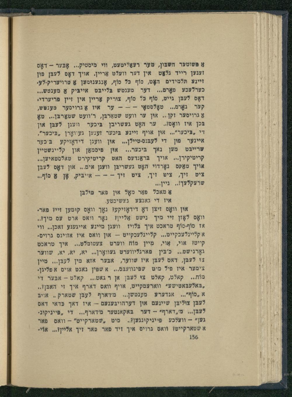 און װאָס זיצן דאָ דידאָזיקע? נאָך װאָס קומען זיי? פאר. װאָס לאָזן זיי מיך נישט אַליין! נאָר ואס ארט עס מיך!. אז סוֹףסוֹף טראכט איך בּלױז וועגן מיינע אייגענע זאכן... וי א קליינלעכקייט... קליינלעכקייט-- און וואס איז אזוינס גרויס. קייט? אוי, אַױי, מֵיין מוֹח ווערט צעטומלט... איך טראכט גאָרנישט... כ'בּין פארגליווערט געוװאָרן... יא, יא, יא, שווער צוּ לעבּן, דאס לעבּן איז שווער, אבּער אזא מין לעבּן... מיין צימער איז מיל מיט עפֿינװעגּס... א שפּין נאגט אויס א פליגן. מוֹח... קאלט, קאלט צו לעבּן אן ר גאט... קאלט- אבּער די ;בּאלעבּאטישע* ווארעמקייט, אויף וואס דארף איך זי האבן!.. א ,סוֹף"... אנדערע מענטשן.. מ'דארף לעבּן שטארק.. אויבֿ לעבּן צוּליבּן שיינעם און דערהויבּענעם-- איז דאך כּדאי דאס לעבּן... מ',דארף"-- דער בּאקאנטער מידארף... די ,פּייניקוג. גען"- וועלכע פּֿייניקונגען?.. מיט ,שטארקייט"- וואס פֿאר א שטארקייט? וואס גרויס איך זיד פאר פאר זיך אליין?... אוֹי.