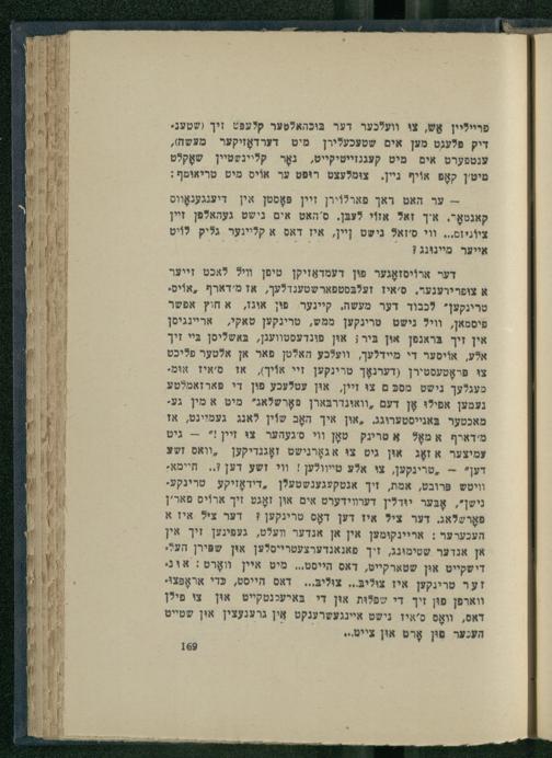 מעגלעך נישט מסכּ ם צוּ זיין, אוּן עטלעכע פון די פארזאמלטע נעמען אפילו אָן דעם ,וואונדרבּארן פאָרשלאג" מיט א מין גע מאכטער בּאגייסטערוגג. ,אוּן איך האָב שוֹין לאנג געמיינט, אז מ'דארף א מאָל א טרינק טאָן וי ס'געהער צוּ זיין!*-- גיט עמיצער א זאָג אוּן גיט צוּ אגאָרנישט זאָגנדיקען ,וואס זשצ דען"-- ,טרינקען, צו אלע טייוולען! וי זשע דען?.. חיימא: וויטש פּרובט, אמת, זיך אנטקעגענשטעלן ,דידאָזיקע טרינקענישן", אָבֶּער יוּדלין דערוידערט אים אוּן זאָגט זיך ארוֹיס פאר'ן פאָרשלאג. דער צי? איז דען דאָס טרינקען? דער ציל איז א העכערער; אריינקומען אין אן אנדער װעלט, געפינען זיך אין אן אנדער שטימוּנג, זיך פאנאנדערצעטרייסלען און שפּירן העלי דישקייט און שטארקייט, דאס הייסט... מיט איין װאָרט: אוּני זער טרינקען איז ציליבּ.. צוליבּ... דאס הייסט, כּדי אראָפַּצוֹי ווארפן פוּן זיך די שפלות אוּן די בּאיעכנטקייט אוּן צו פילן דאס, װאָס ס'איז נישט איינגעשרענקט אִין גרענעצין אוּן שטייט העכער פוּן אָרט אוּן צייט..= 19