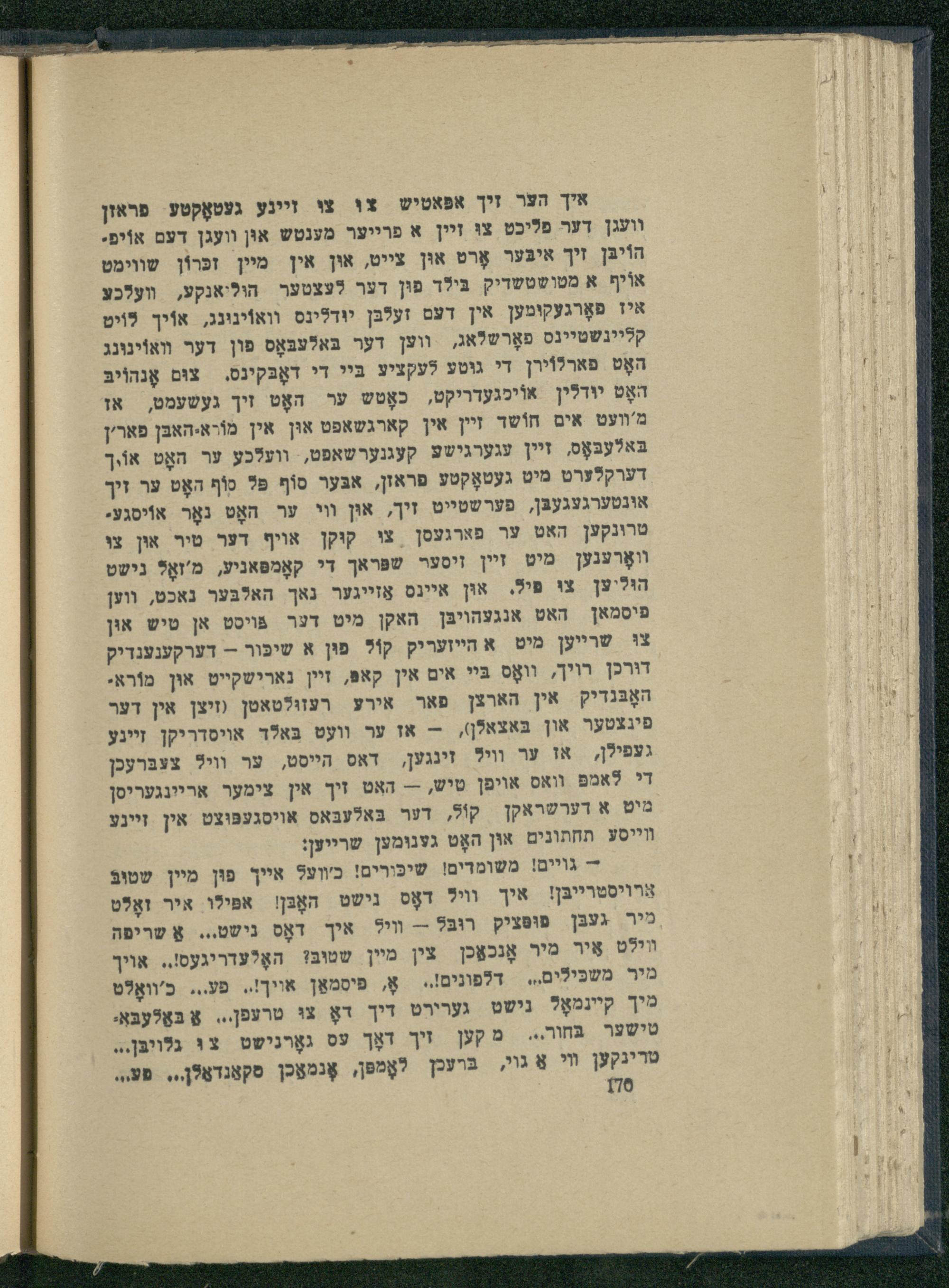 -- גויים! משומדים! שיכּורים! כ'װעל אייך פוּן מיין שטובֿ אַרױסטרייבּן! איך וויל דאָס נישט האָבּן אפּילו איר ואָלט מיר געבּן פופּציק רוּבּל-- װיל איך דאָס נישט... אַ שריפה װילט אִיר מיר אָנכאַכן צין מיין שטוב? האָלעדריגעס!.. אויך מיר משכּילים... דלפונים!., אָ, פּיסמאַן אויך!.. פע... כ'װאָלט מיך קיינמאָל נישט גערירט דיך דאָ צוּ טרעפן... א בּאַלעבּאַ. טישער בּחור... מ קען זיך דאָך עס גאָרנישט צוּ גלויבּן... טרינקען װי אַ גוי, בּרעכן לאָמפּן, אָנמאַכן סקאַנדאַלן,.. סע.,.