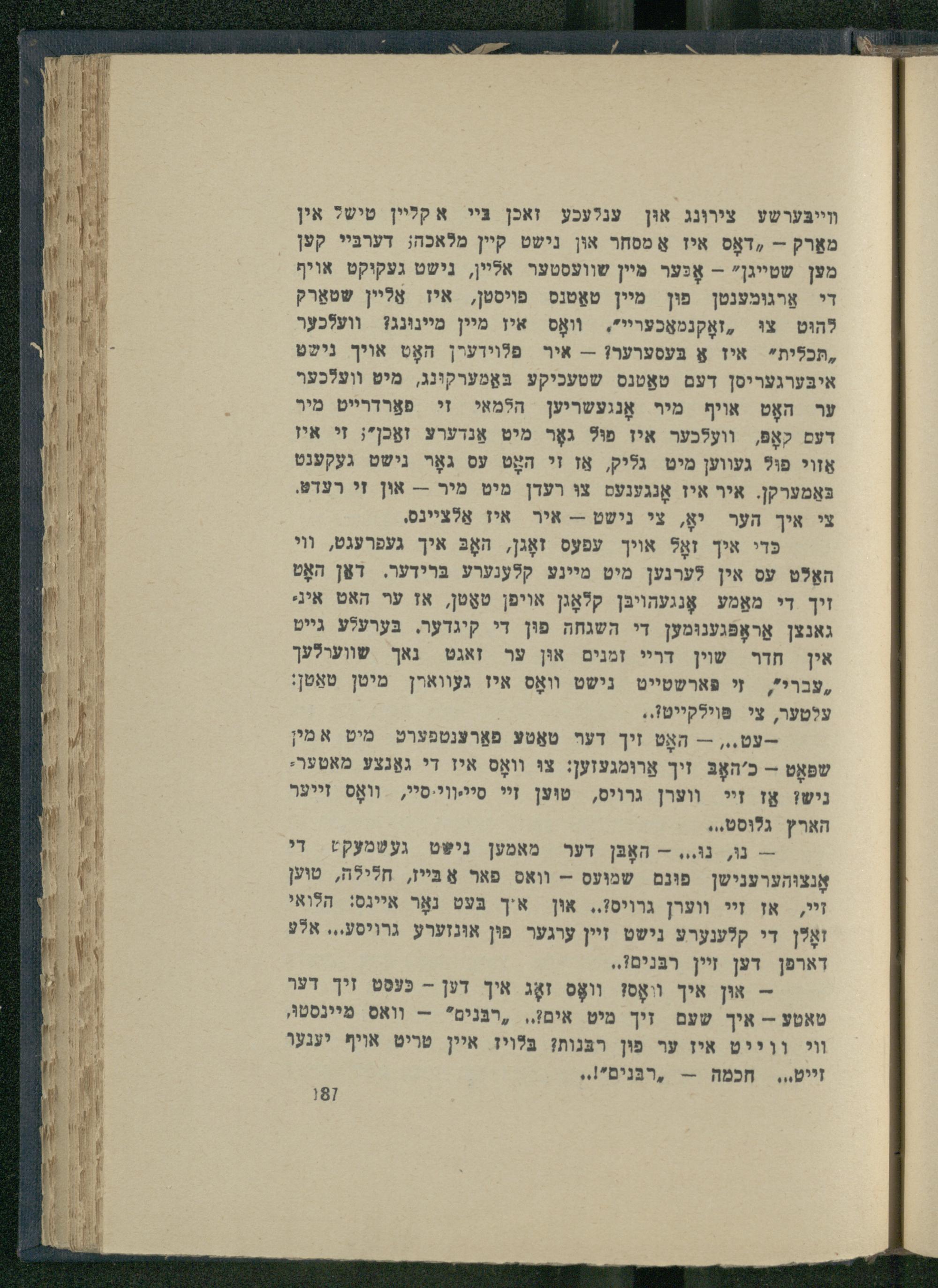 - אוּן איך װאָס! װאָס זאָג איך דען- כּעסט זיך דער טאטע-- איך שעם זיך מיט אים!,. ,רבּנים"-- וואס מיינסטוּ װי ווייט איז ער פוּן רבּנות? בּלױז איין טריט אױיף יענער זייט,.. חכמה-- ,רבּנים"ו.,
