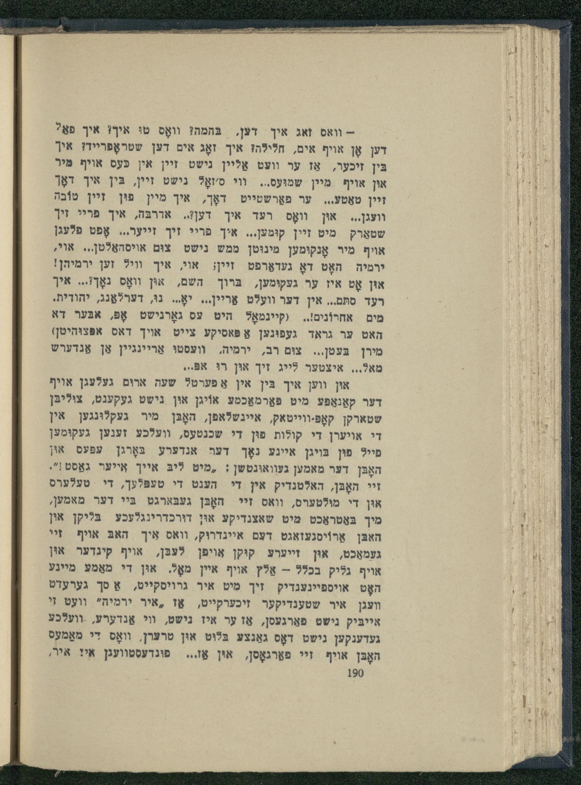 - וואס זאג אין דען, בּהמה? װאָס טוּ איך? איך פאַ? דען אָן אויף אים, חלילה? איך זאָג אים דען שטראָפּרײד? איך בּין זיכער, אַז ער וועט אַליין נישט זיין אין כּעס אויף מיר אוּן אויף מיין שִמוּעס.. וי ס'זאָל נישט זיין, בִּין איך דאָך זיין טאַטע... ער פאַרשטייט דאָך, איך מיין פוּן זיין טוֹבה וועגן... און װאָס רעד איך דען?. אדרבּה, איך פריי זיך שטאַרק מיט זיין קוּמען... איך פריי זיך זייער... אָפט פלעגן אויף מיר אָנקומען מינוּטן ממש נישט צוּם אױסהאַלטן... אוי, ירמיה האָט דאָ געדאַרפט זיין; אוי, איך וויל זען ירמיהן! אוּן אָט איז ער געקומען, בּרוך השם, אוּן װאָס נאָך!... איך רעד סתּם... אין דער וועלט אַרײין... יאָ.. נוּ, דערלאַנג, יהודית. מים אחרוֹנים!.,(קיינמאָל היט עס גאָרנישט אָפּ, אבּער דא האט ער גראד געפונען אַ פּאסיקע צייט אויך דאס אפּצוּהיטן) מירן בּעטן... צוּם רב, ירמיה, וועסטו אַריינגײין אַן אַנדערש מאל... איצטער לייג זיך אוּן רוּ אפּ.