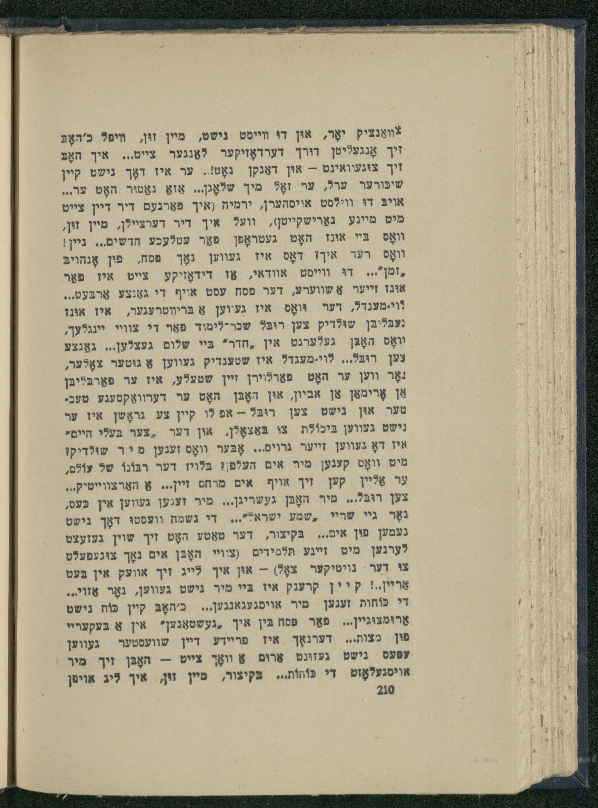 צװאַנציק יאָר, אוּן דוּ װייסט גישט, מיין זוּן, יפל כ'האָבּ זיך אָנגעליטן רורך דערדאָזיקער לאַנגער צייט,.. איך האָבּ זיך צוּגעוואינט- אוּן דאַנקן נאָט!. ער איז דאָך נישט קיין שיכּורער ערל, ער זאָל מיך שלאָגן... אַזאַ נאַטוּר האָט ער.., אויבּ דוּ ווילסט אייסהערן, ירמיה(איך פאַרגעם דיר דיין צייט מיט מיינע נאַרישקײיטן), וואל איך דיר דערציילן, מיין זון, װאָס בּײ אונז האָט געטראָפן פאַר עטלעכע חדשים... ניין| װאָס רעד איך! דאָס איז געווען נאָך פסח, פֿון אָנהױבּ ,זמן'... דוּ װײיסט אוודאי, אַז דידאָזיקע צײט איז פאַר אונז זייער אַ שווערע, דער פסח עסט אויף די גאַנצע אַרבּעט... ווי-מענדל, דער וּואָס איז געיוען אַ בּריװוטרעגער, איז אונן געבּליבּן שולדיק צען רובּל שכר-לימוד פֿאַױ די צוויי יינגלעך, װאָס האָגּן געלערנט אין ,חדר" בּיײ שלום געצלען... גאַנצע צען רוּבּל.., לוי.-מעגדל איז שטענדיק געווען אַ גוּטער צאָלער, נאָר ווען ער האָט פאַרלױירן זיין שטעלע, איז ער פאַרבּלִיבּן אַן אָרימאַן אַן אביון, אוּן האָבּן האָט ער דערוואַקסעגע טעכ. טער אוּן נישט צען רוב- אפ לו קיין צע גראָטן איז ער נישט געווען בּיכוֹלת צו בּאַצאָלן, אוּן דער ,צער בּעלֵי היים. איז דאָ געווען זייער גרויס... אָבּער װאָס זענען מ יר שילדיק? מיט װאָס קענען מיר אים העלפן? בּלױז דער רבּוֹנוֹ של צוֹלִם, ער אַליין קען זיך אויף אים מרחס זיין... אַ האַרצװײטיק.., צען רוּבל... מיר האָבּן געשריגן... מיר זענען געווען אין כּעט, נאָר גי שױיי ,שמע ישראל"... די נשמה וועסטוּ דאָך נישט נעמען פון אים,.. בּקיצור, דער טאַטע האָט זיך שוין געזעצט לערנען מיט זיינע תּלמידים(צוויי האָבּן אים נאָך צוּגעפעלט צוּ דער נויטיקער צאָל)- אוּן איך לייג זיך אוועק אין בֶּעט אַרין..! קיין קרענק איז בי מיר נישט געווען, נאָר אַזוֹי... די כּוֹחות זענען מיר אויסגעגאנגען,.. כ'האָבּ קיין כּוֹח נישט אַרוּמצוּגײן... פאַר פּסח בּין איך ,געשטאַנען" אין אַ בּעקערײ פון מצות.., דערנאָך איז פריידע דיין שוועסטער געווען עפעס נישט געזוּנט אַרוּם אַ װאָך צייט-- האָבּן זיך מיר אױסגעלאָזוט די כּוֹחוֹת.., בּקיצור, מיין זון, איך ליג אויטן 20