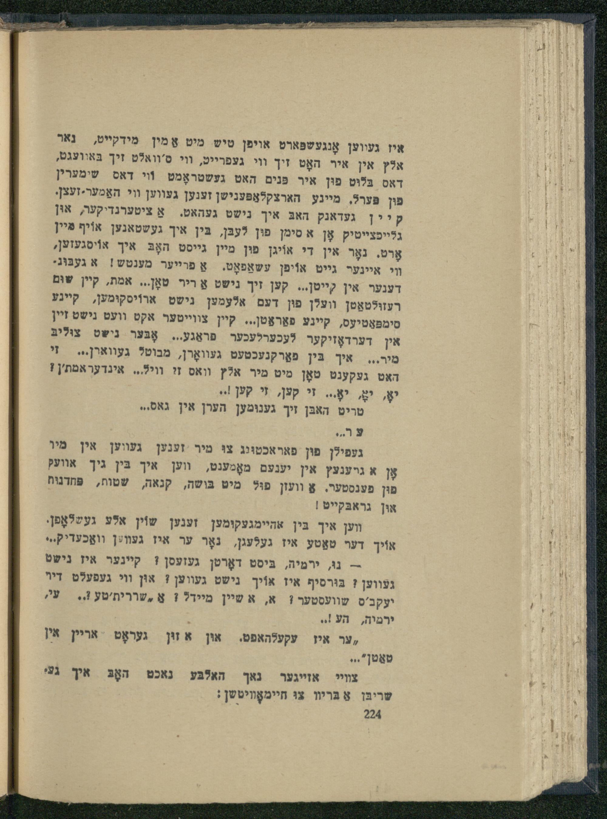 איז געווען אָנגעטפּארט אויפן טיש מיט אַמין מידקײט, נאר אלץ אין איר האָט זיך וי געפרייט, וי ס'וואלט זיך בּאוועגט, דאס בּלוּט פוּן איך פּנים האט געשטראָמט וי דאס שימערין פון פּערל, מיינע הארצקלאַפּענישן זענען געווען וי האַמער-זעצן. קיין געדאנק האבּ איך נישט געהאט. אַ ציטערנדיקער, אוּן גלייפצייטיק אָן א סימן פוּן לעבּן, בּין איך געשטאנען אוֹיף פּיין אָרט. נאָר אין די אוֹיגן פוּן מיין גייסט האָבּ איך אוֹיסגעזען, װי איינער גייט אוֹיפן עשאַפאָט. אַ פריער מענטש! א געבּוּגֿי דענער אין קייטן... קען זיך נישט אַ ריר טאָן... אמת, קיין שוּם רעזולטאַטן וועלן פוּן דעם אלעמען נישט ארוֹיסקוּמען, קיינע סימפּאַטיעס, קיינע פאַראַטן... קיין צווייטער אקט וועט נישט זיין אין דערדאָזיקער לעכערלעכער פראַגע... אָבּער נישט צוליבּ מיר... איך בִּין פאַרקנעכטעט געװאָרן, מבוט? געווארן... זי האט געקענט טאָן מיט מיר אלץ וואס זי וויל?... אינדעראמת'ן 1 יאָ, יאָ, יאָ... זי קען, זי קען וי