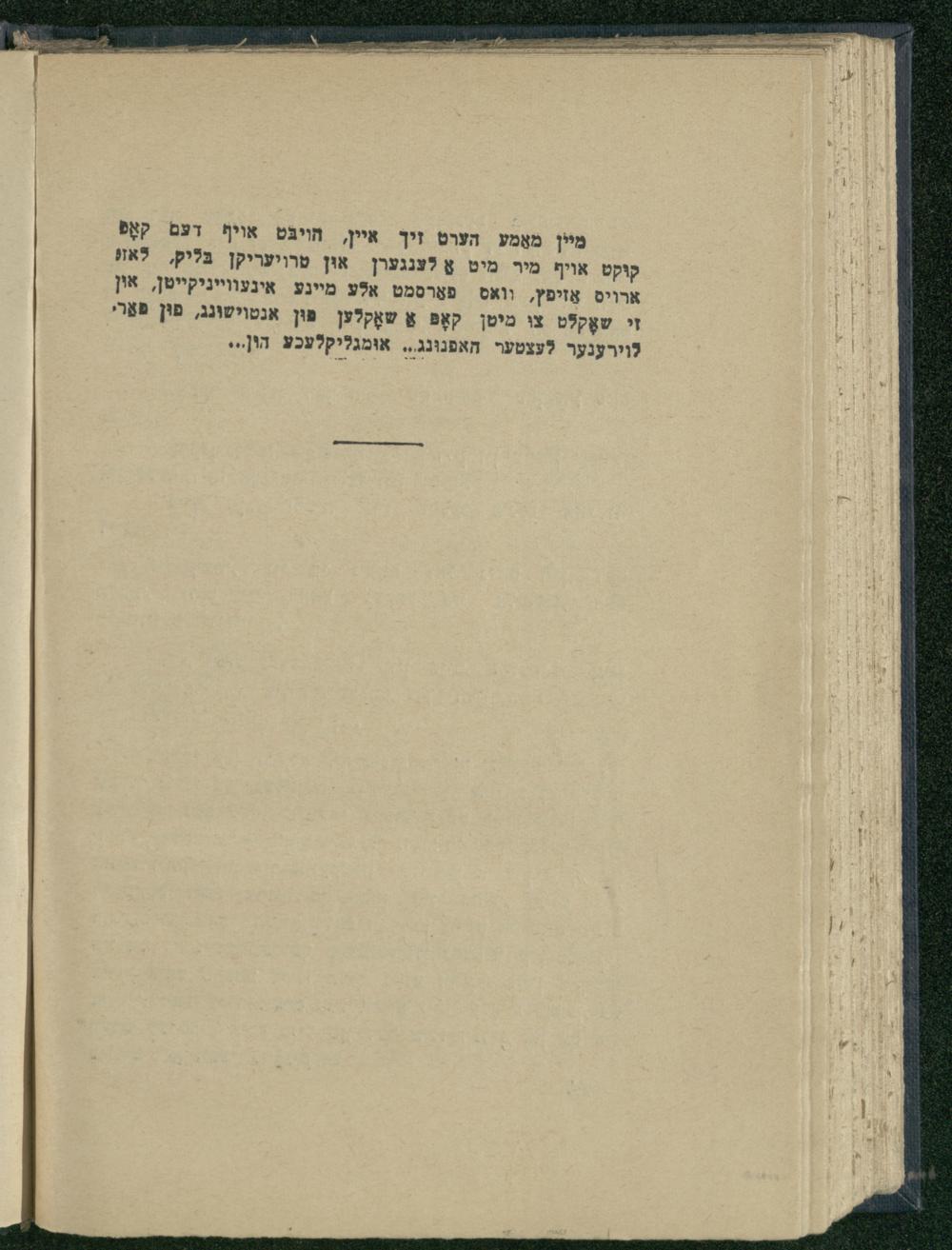 מיין מאַמע הערט זיך איין, הויבּט אויף דעם קאָפּ קוקט אויף מיר מיט אַ לצנגערן אוּן טרויעריקן בּליק,?א ארויס אַזיפץ, וואס פאַרסמט אלע מיינע אינעווייניקײטן, אוּן זי שאָקלט צו מיטן קאָפּ אַ שאָקלען פוּן אנטוישונג, פוּן פאַרי לוירענער לעצטער האפנונג... אומגליקלעכע קון...
