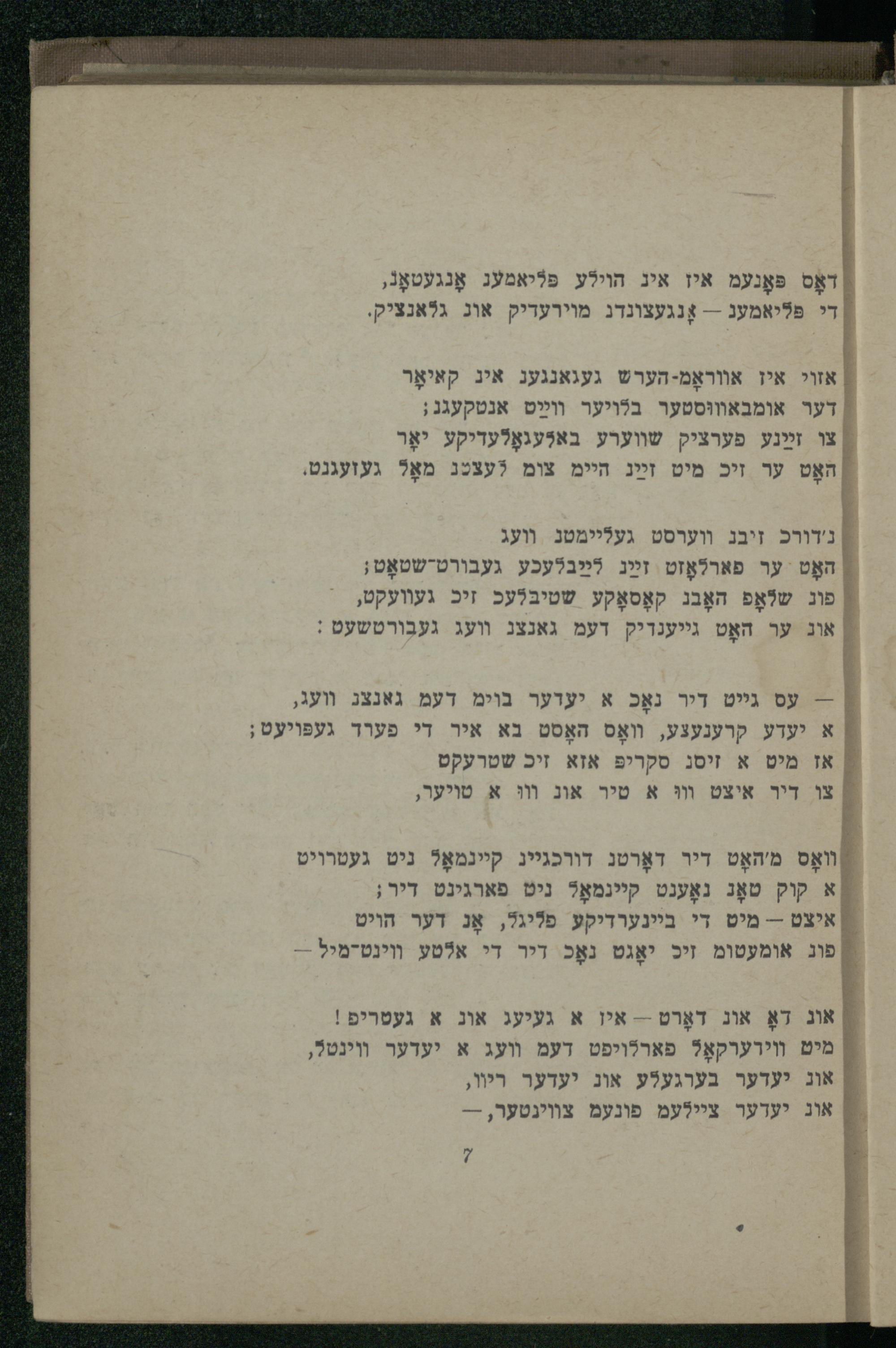 נ'דורכ זיבג ווערסט געליימטנ וועג האָט ער פארלאָזט זײַג לײַבלעכע געבורט-שטאָט; פוג שלאָפּ האָבג קאָסאָקע שטיבּלעכ זיכ געוועקט,