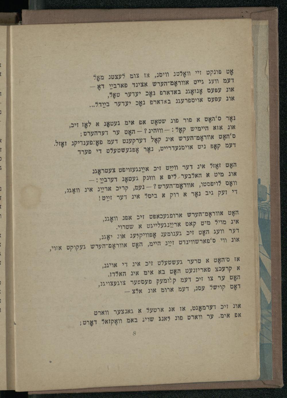 אז ס'האָט א טרער געשטעלט זיכ איג די אוגג, א קרעכצ פאריזנעט האָט בא אימ איג האלרן. האָט ער צו זיכ דעמ קלומעק פעסטער צוגעצויגג, דאָס קוישל עסנ, דעמ ארומ אוג אלצ