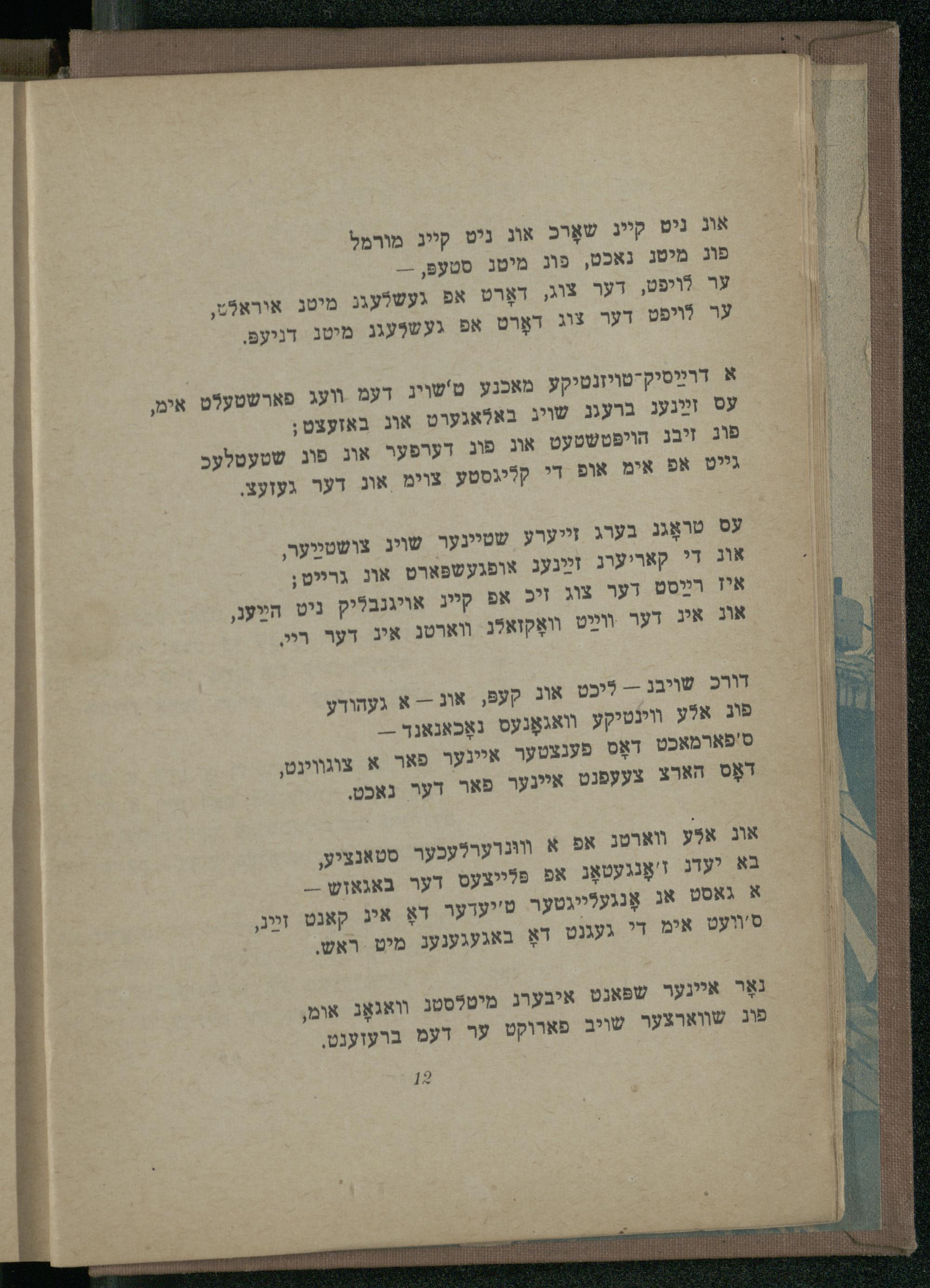 עס טראָגג בערג זייערע שטיינער שויג צושטלַער, אוב די קאריערג זײַנעג אופגעשפּארט אונ גרייט; איז רײַסט דער צוג זים אפ קייג אויגנבליק ניט הײַעגֿ, אוב איג דער װײַט װאָקזאלג ווארטנ איג דער ריי,