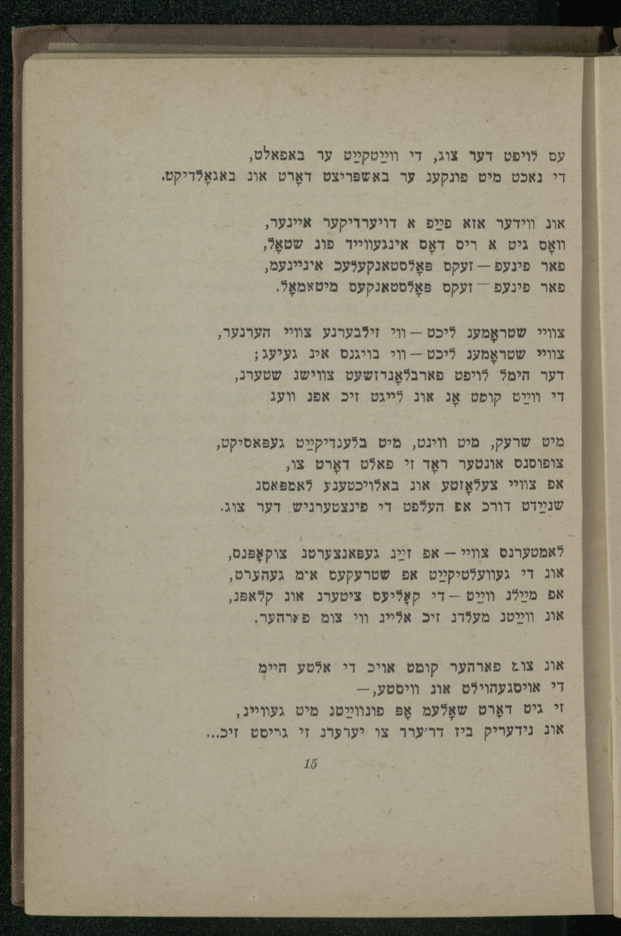 עס לויפט דער צוג, די װײַטקײַט ער באפאלט, די נאכט מיט פונקעג ער באשפּריצט דאָרט אונ באגאָלדיקט.