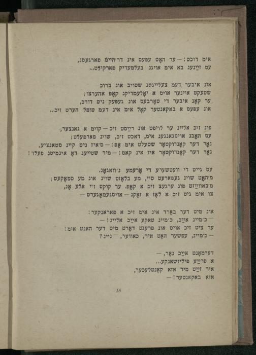 אונ איבער דעמ צעלייגטג שטויב אוג ברוכ שטעקט איינער אויס א יאָלעמריקנ קאָפּ אהערצו; ער קאָג איבער די טאָרבעס אונ געפּעק ניט דורכ, אונ עפּעס א באקאנטער קאָל אימ איג דעמ טומל הערט זיכ..