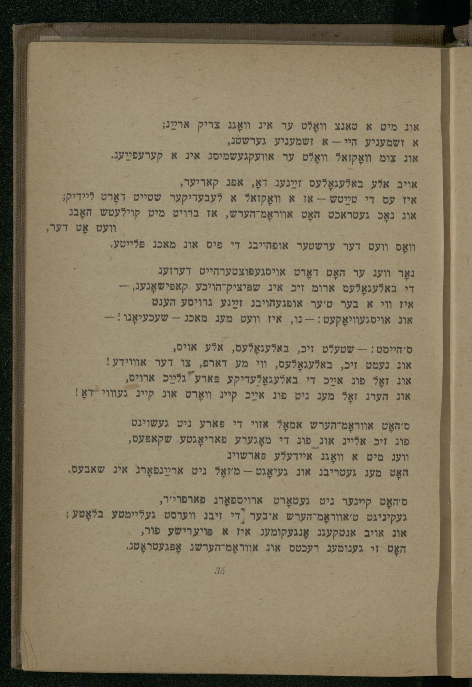 די באלעגאָלעס ארומ זיכ אינ שפּיציק-הויכע קאפּישאָנעג,-איז װי א בער ט'ער אופגעהויבנ זײַנע גרויסע הענט