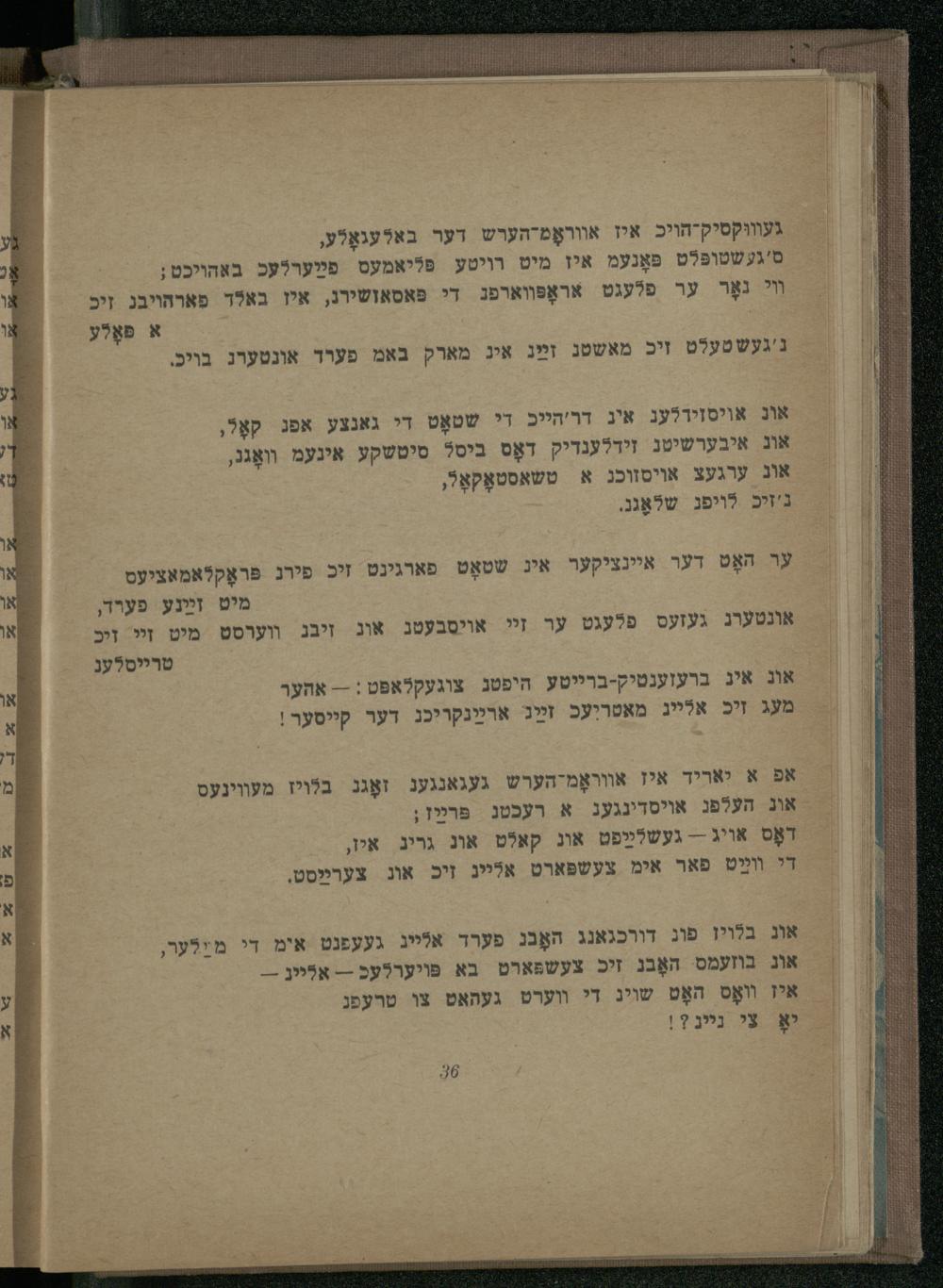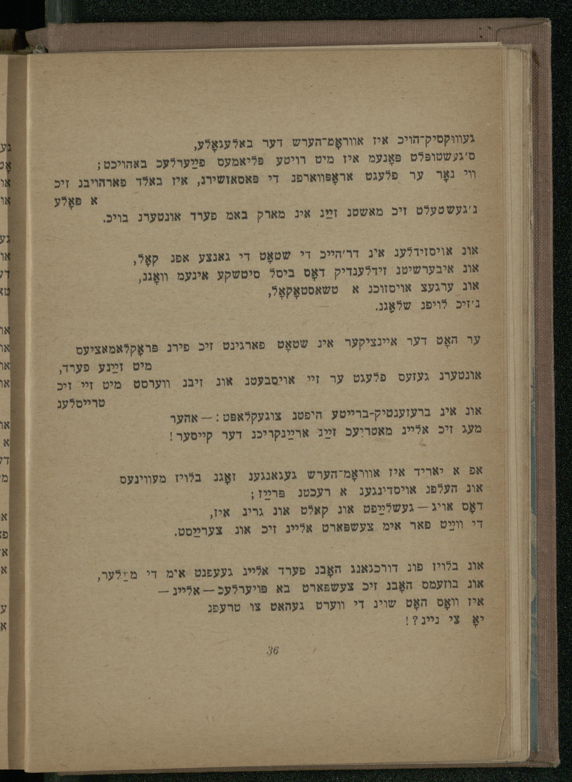 ער האָט דער איינציקער אינ שטאָט פארגינט זיכ פירג פּראָקלאמאציעס מיט זײַנע פערד, אונטערג געזעס פלעגט ער זי אויסבעטג אוג זיבג װערסט מיט זי ויכ טרייסלעג אונ איג ברעזענטיק-ברייטע היפטג צוגעקלאפט:-- אהער מעג זיכ אלייג מאטר!עכ זײַג ארײַנקריכג דער קייסער!