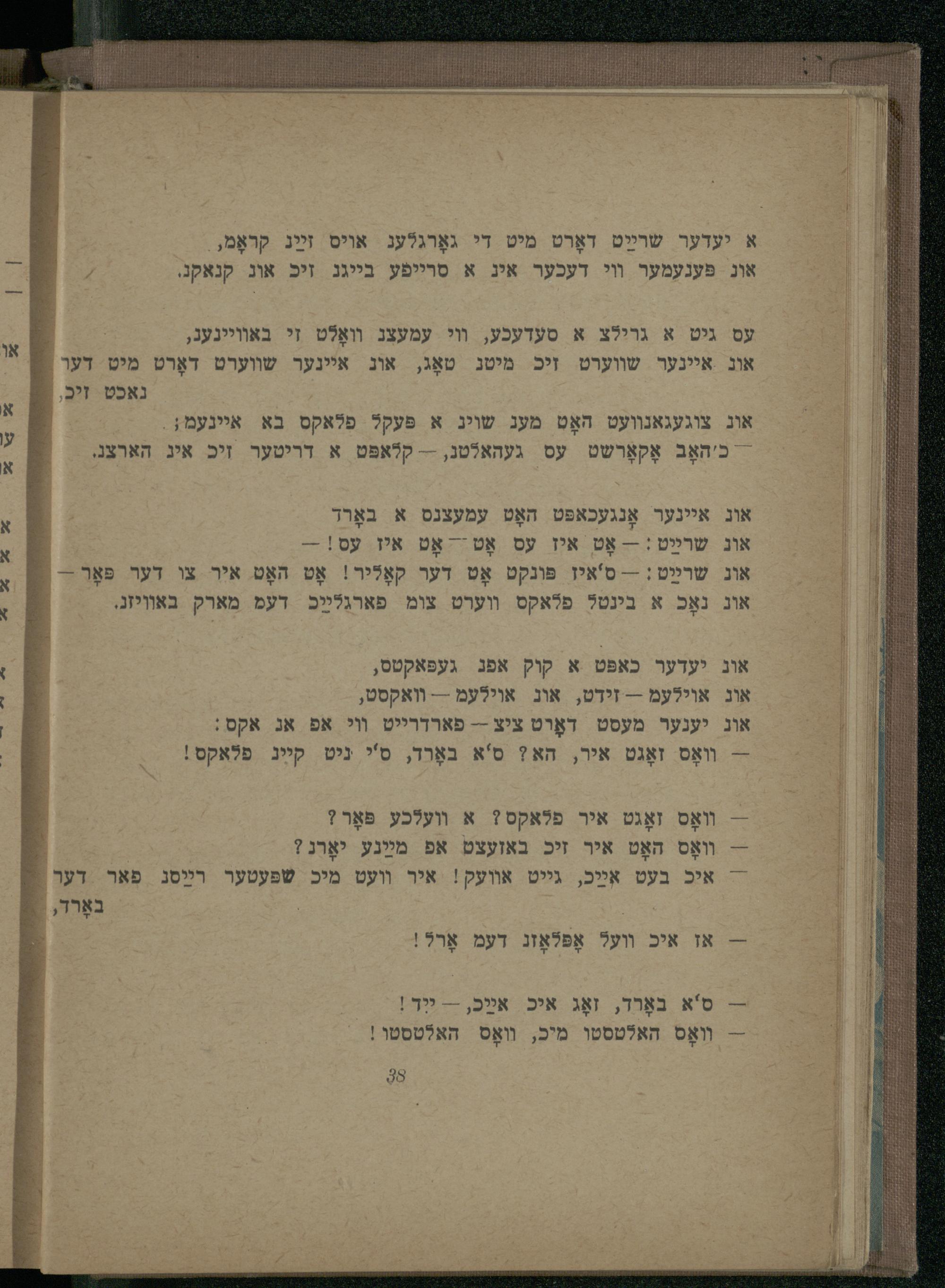עס גיט א גרילצ א סעדעכע, וי עמעצג װאָלט זי באוויינעג, א אוג איינער שווערט זיכ מיטג טאָג, אוג איינער שווערט דאָרט מיט דער, נאכט זיכ,{ אוג צוגעגאנוועט האָט מעג שוינ א פּעקל פלאקס בא איינעמ;.: -יכ'האָב אָקאָרשט עס געהאלטג,-- קלאפּט א דריטער זיכ איג הארצג.|| אוג איינער אָנגעכאפּט האָט עמעצנס א באָרד אוג שרײַט:--אָט איז עס אָט--אָט איז עס!--: אונ שרײַט:-- ס'איז פּונקט אָט דער קאָליר! אָט האָט איר צו דער פאָך-/ אוג נאָכ א בינט? פלאקס װערט צומ פארגלײַכ דעם מארק באוויזג.: