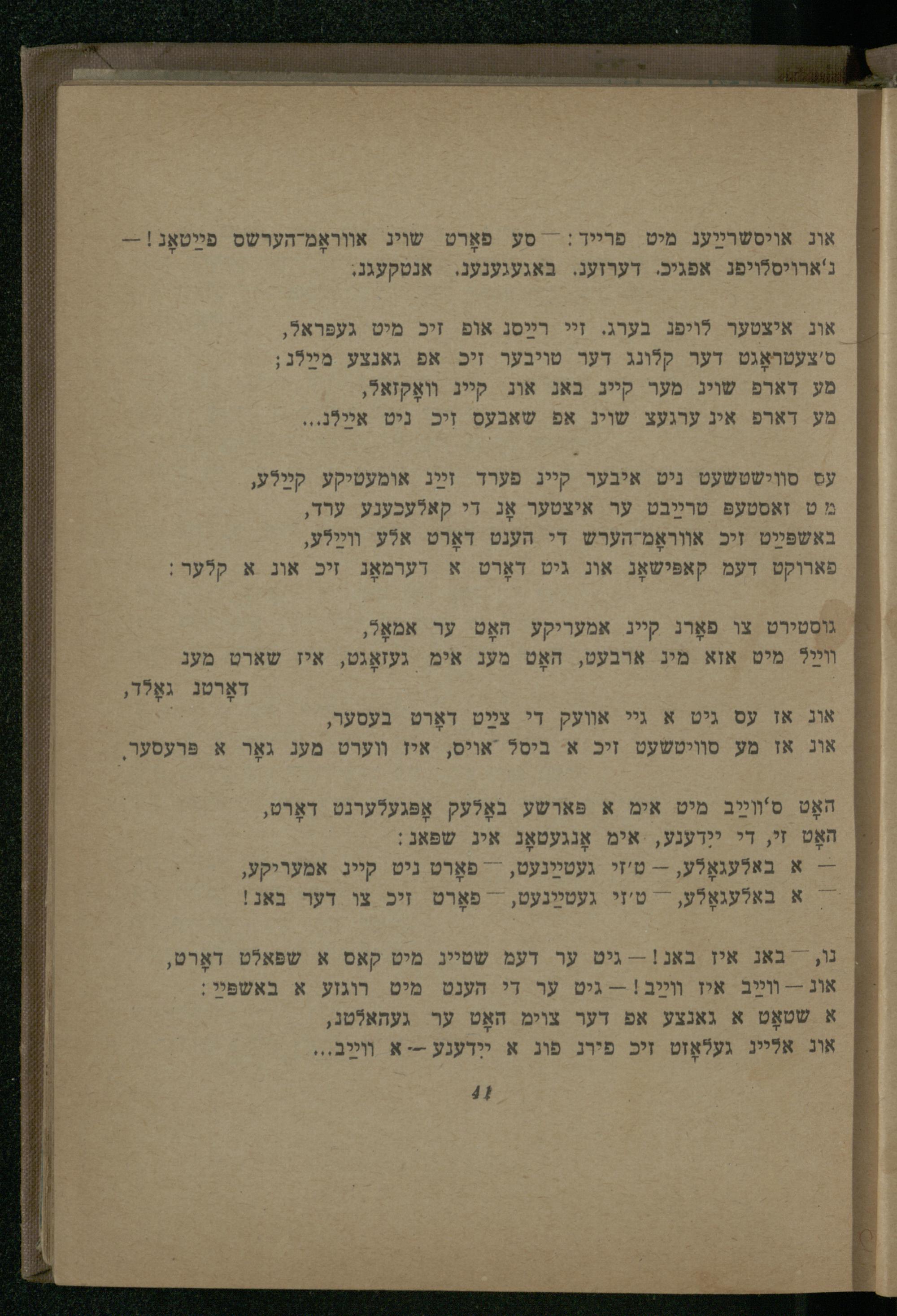 נו, יבאג באגנ!-- גיט ער דעמ שטייג מיט קאס א שפּאלט דאָרט, אוג-- װײַב איז װײַב!-- גיט ער די הענט מיט רוגזע א באשפּל;