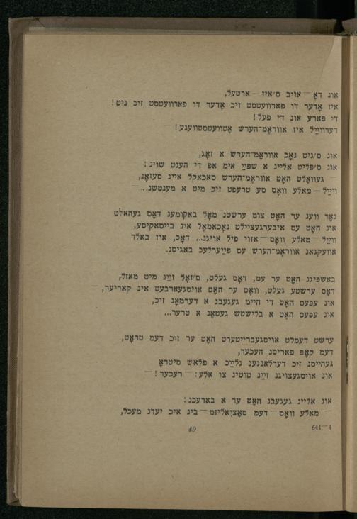 נאָר װעג ער האָט צומ ערשטנ מאָל באקומעג דאָס געהאלט אוג האָט עס איבערגעציילט נאָכאמאָל איג בייסאקיסע, װײַל-- מאלע װאָס- אזוי פיל אויגנ... דאָכ, איז באלד אוועקגאנ אװוראָמ-הערש עס פײַערלעכ באגיסנ.