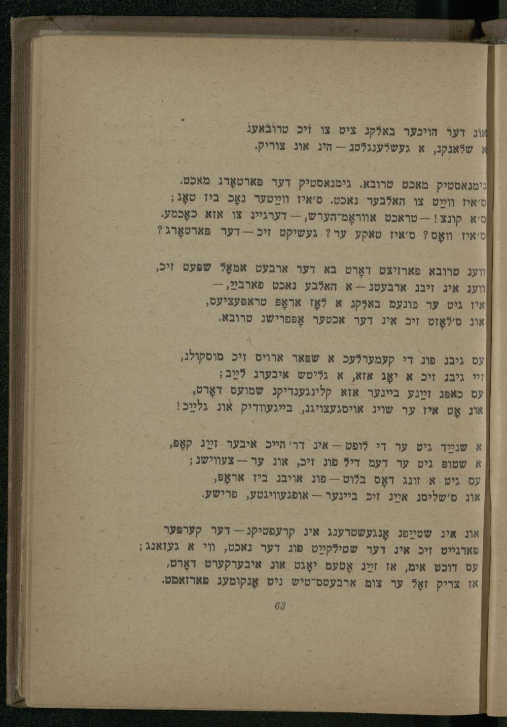 גימנאסטיק מאכט טרובא. גימנאסטיק דער פּארטאָרג מאכט. ס'איז װײַט צו האלבער נאכט. ס'איז װײַטער נאָכ ביו טאָג; ס'א קונצ!-- טראכט אװוראָמ-הערש,-- דערגייג צו אזא כאָכמע. ס'איז װאָס? ס'איז טאקע ער? געשיקט זיכ-- דער פּארטאָרג?