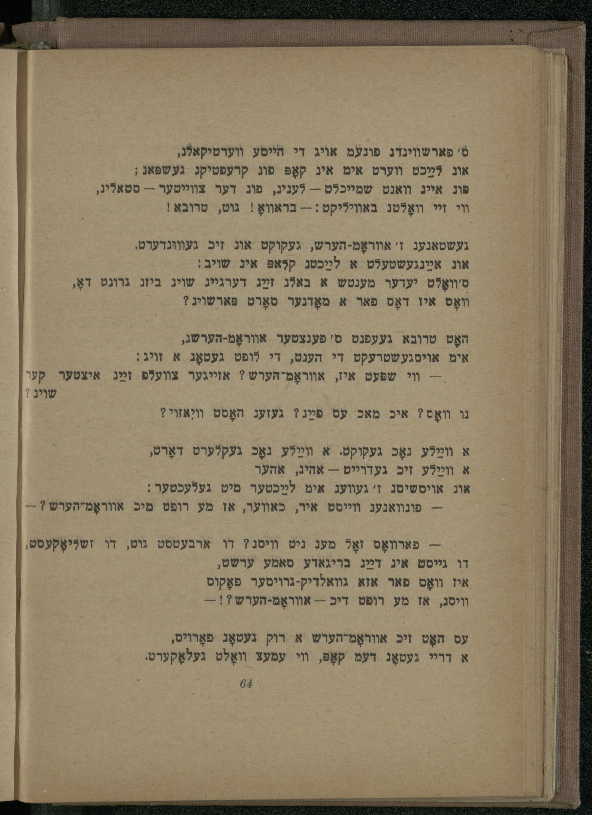-- פארװאָס זאָל מענ ניט ויסנ? דו ארבעטסט גוט, דו זשניאָקעסט, דו גייסט איג דײַג בריגאדע סאמע ערשט, איז װאָס פאר אזא גוואלדיק-גרויסער פאָקוס װויסג, אז מע רופט דיכ-- אװראָמ-הערש?!-