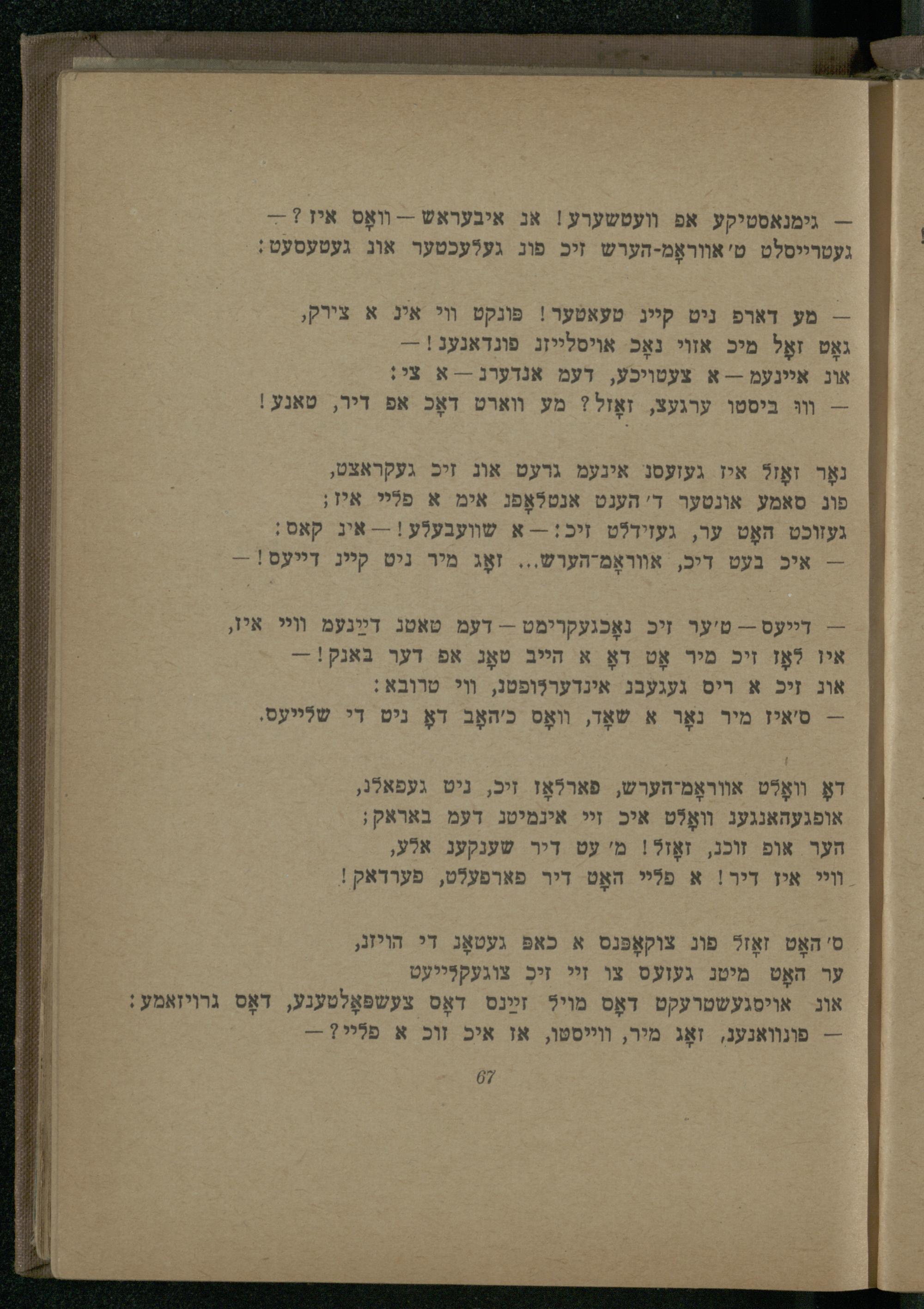 אונ אויסגעשטרעקט דאָס מוי? זײַנס דאָס צעשפּאָלטענע, דאָס גרויזאמע: -- פונוואנעג, זאָג מיר, ווייסטו, אז איס זוכ א פליי?-