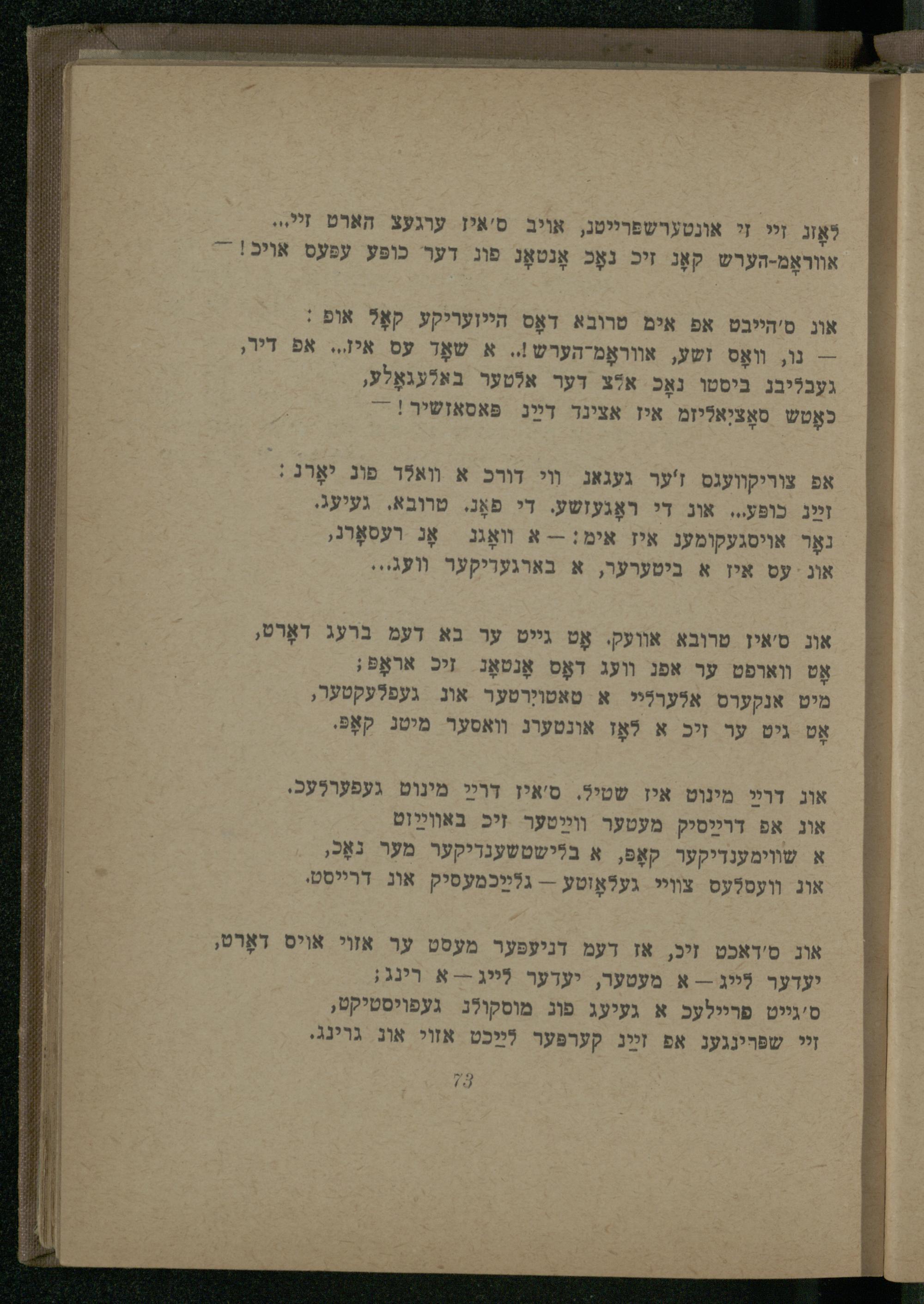אוג ס'איז טרובא אוועק. אָט גייט ער בא דעמ ברעג דאָרט, אָט ווארפט ער אפנ וװעג דאָס אָנטאָג זיכ אראָפֿ;