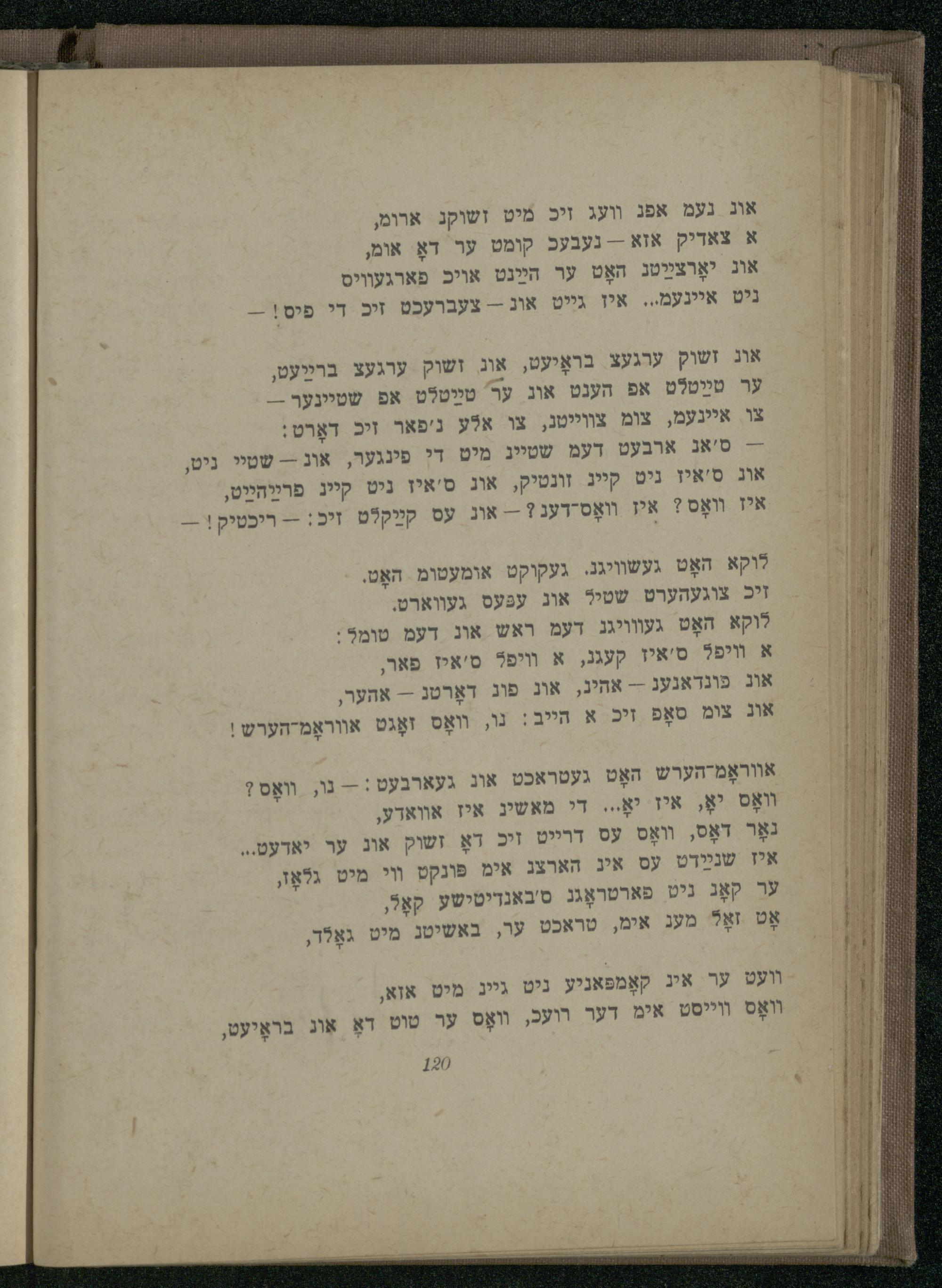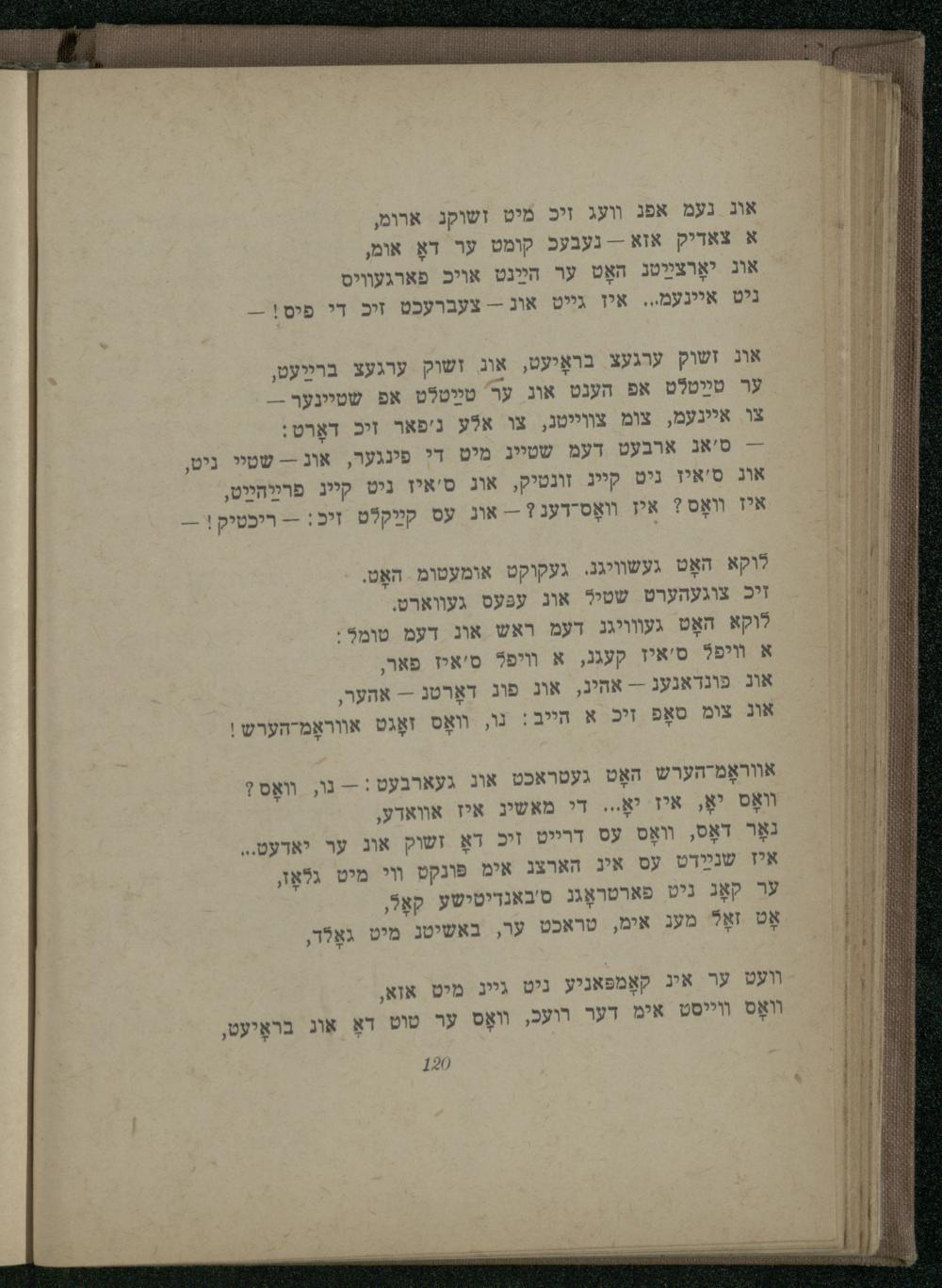 גאָר דאָס, װאָס עס דרייט זיכ דאָ זשוק אוג ער יאדעט... איז שנײַדט עס אינ הארצג אימ פּונקט װי מיט גלאָז, ער קאָג ניט פארטראָגג ס'באנדיטישע קאָל,