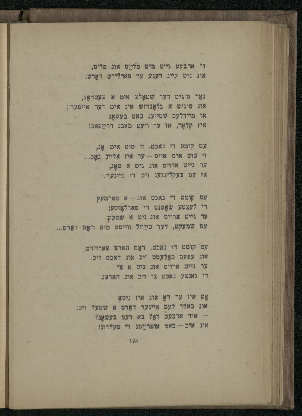 עס קומט די נאכט. דאָס הארצ פארזידט, אונ עפּעס כאָלעמט זיכ אוג דאכט זיכ, ער גייט ארויס אוג גיט א צי