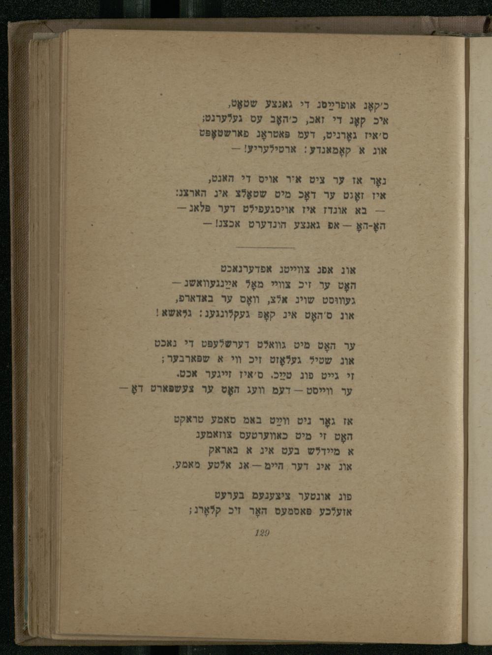 נאָר אז ער ציט איר אויס די האנט, איז זאָגט ער דאָכ מיט שטאָלצ איג הארצנ: -- בא אונדז איז אויסגעפילט דער פּלאג-האָ-האָ-- אפ גאנצע הונדערט אכצנ!-