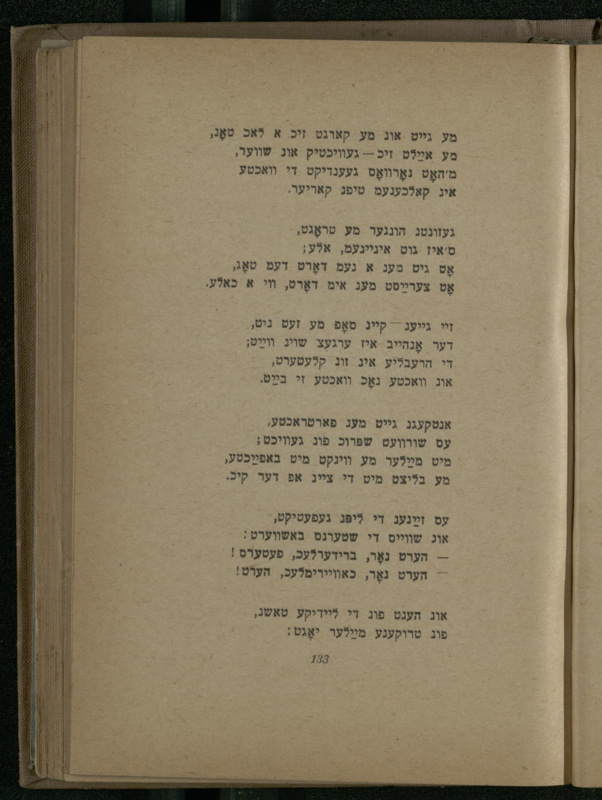 זײ- קייג סאָפ מע זעט ניט, דער אָנהייב איז ערגעצ שויג װײַט; די הרעבליע אינ זונ קלעטערט, אוג וואכטע נאָכ וואכטע זי בײַט.