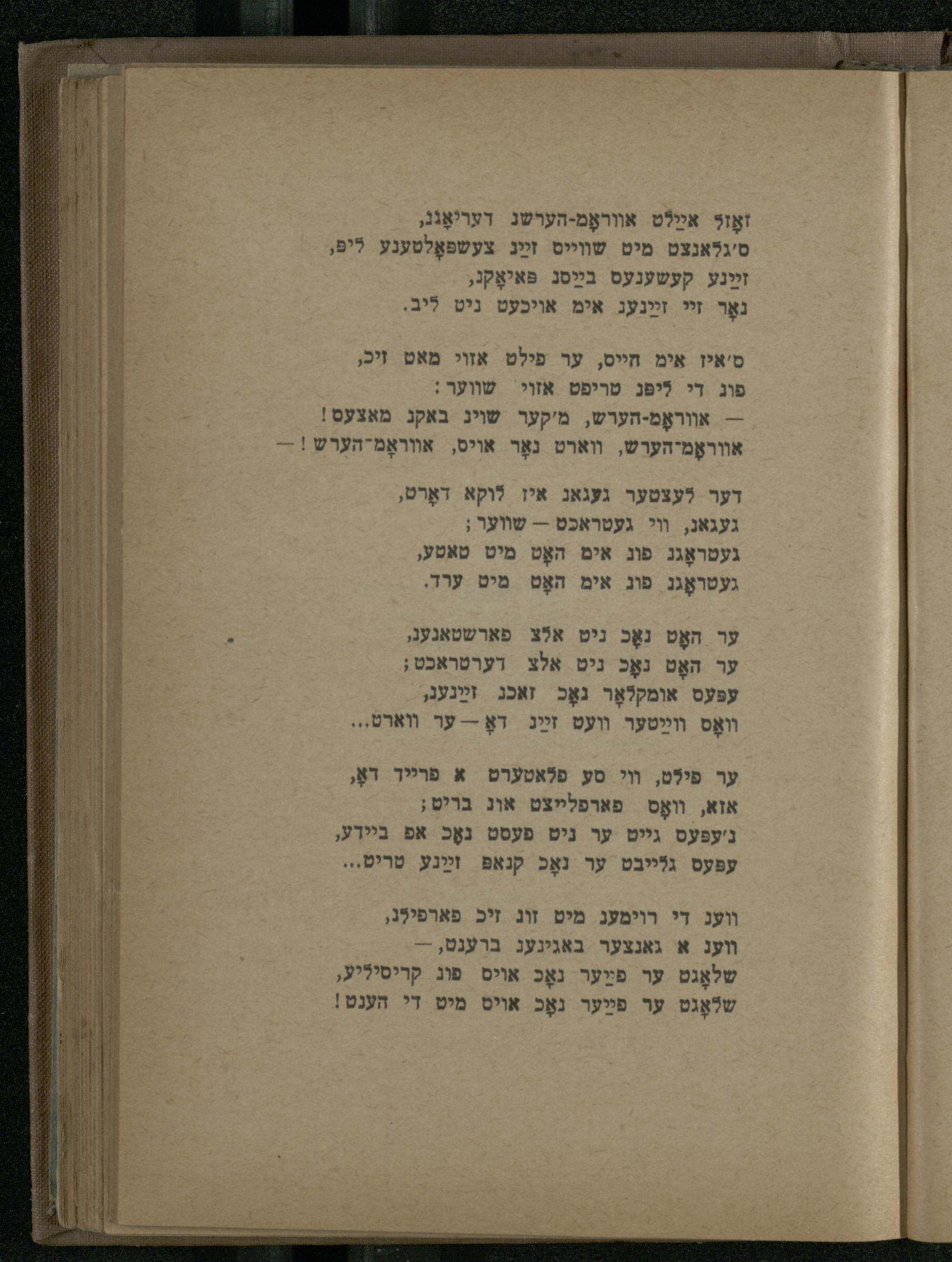 זאָל אײַלט אווראָמ-הערשג דעריאָגגֿ, סיגלאנצט מיט שווייס זײַג צעשפּאָלטענע ליפּ, זײַנע קעשענעס בײַסג פּאאָקג,