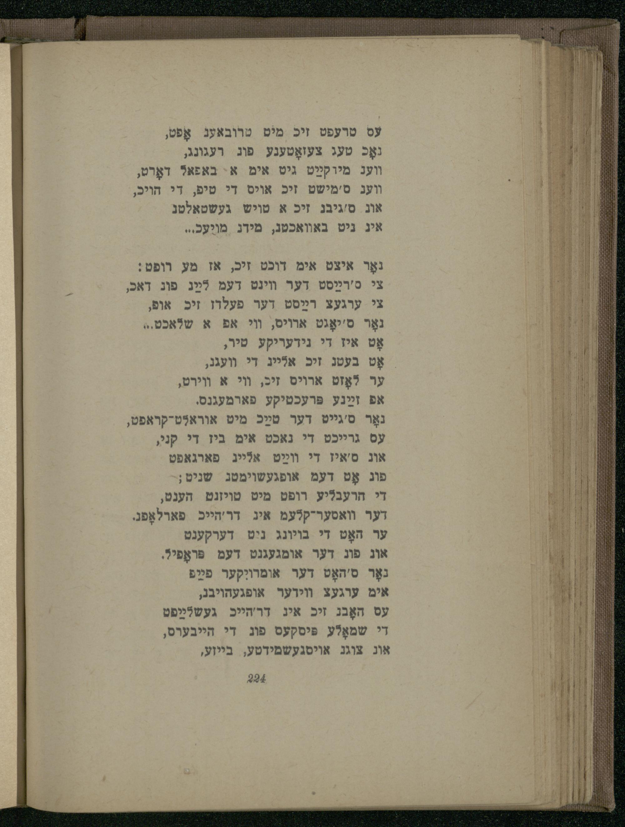 נאָר איצט אימ דוכט זיכ, אז מע רופט: צי ס'רײַסט דער וינט דעמ לײַג פוג דאכ, צי ערגעצ רײַסט דער פעלדז זיכ אופ, נאָר ס'יאָגט ארויס, װי אפ א שלאכט... אָט איז די נידעריקע טיר,