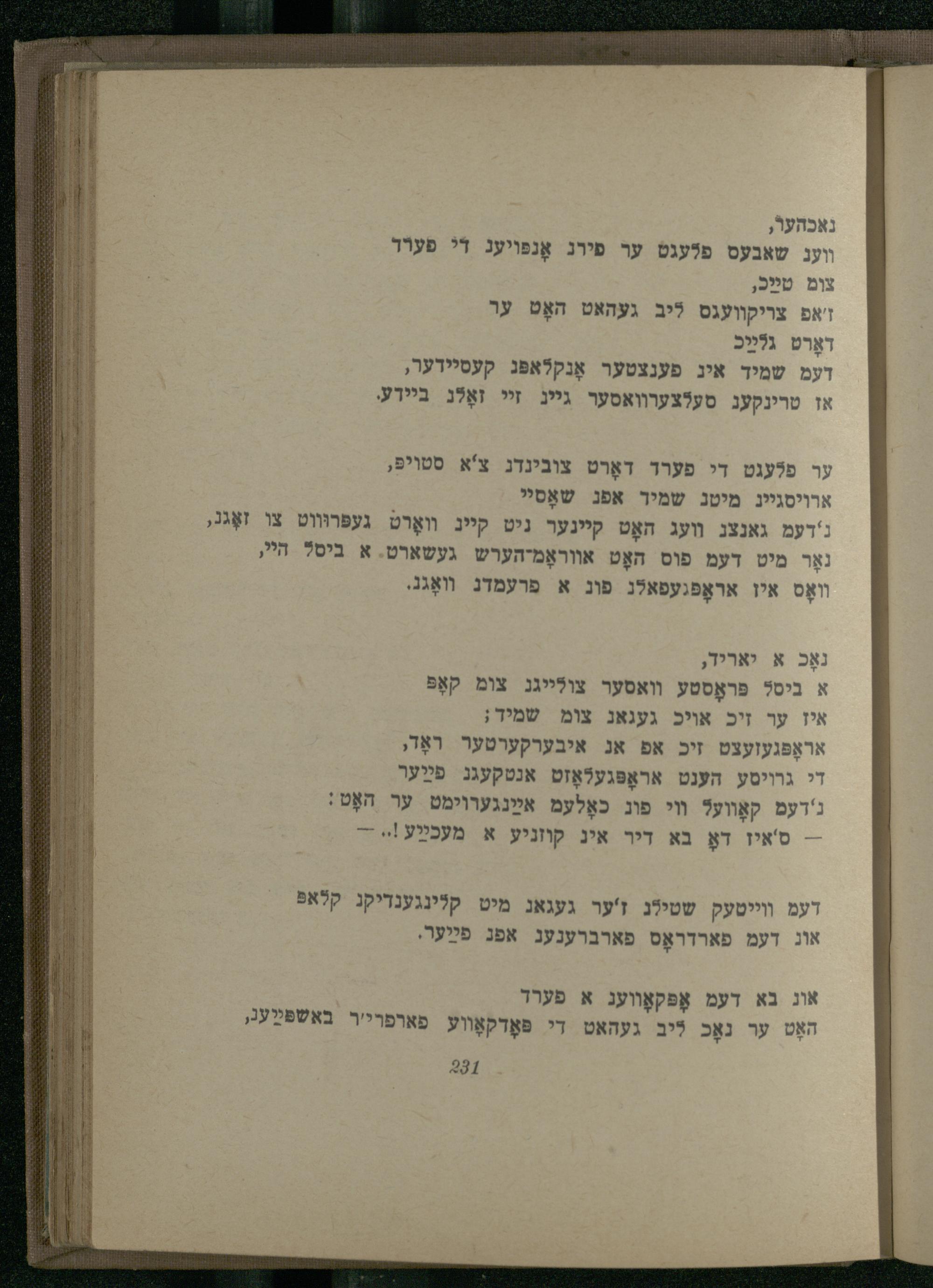 דעמ ווייטעק שטילג ז'ער געגאג מיט קלינגענדיקג קלאפ אוג דעמ פארדראָס פארברענעג אפנ פּײַער.