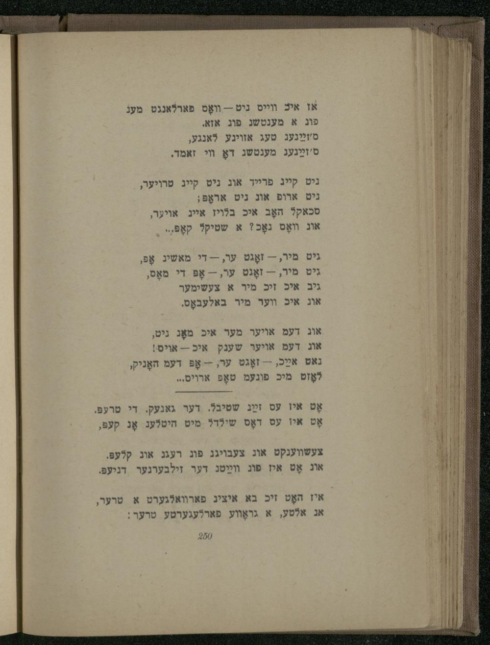 אוג דעמ אוער שענק איכ-- אויס! נאט אעַכ,-- זאָגט ער,--אָפּ דעמ האָניק, לאָזט מיכ פונעמ טאָפּ ארויס...