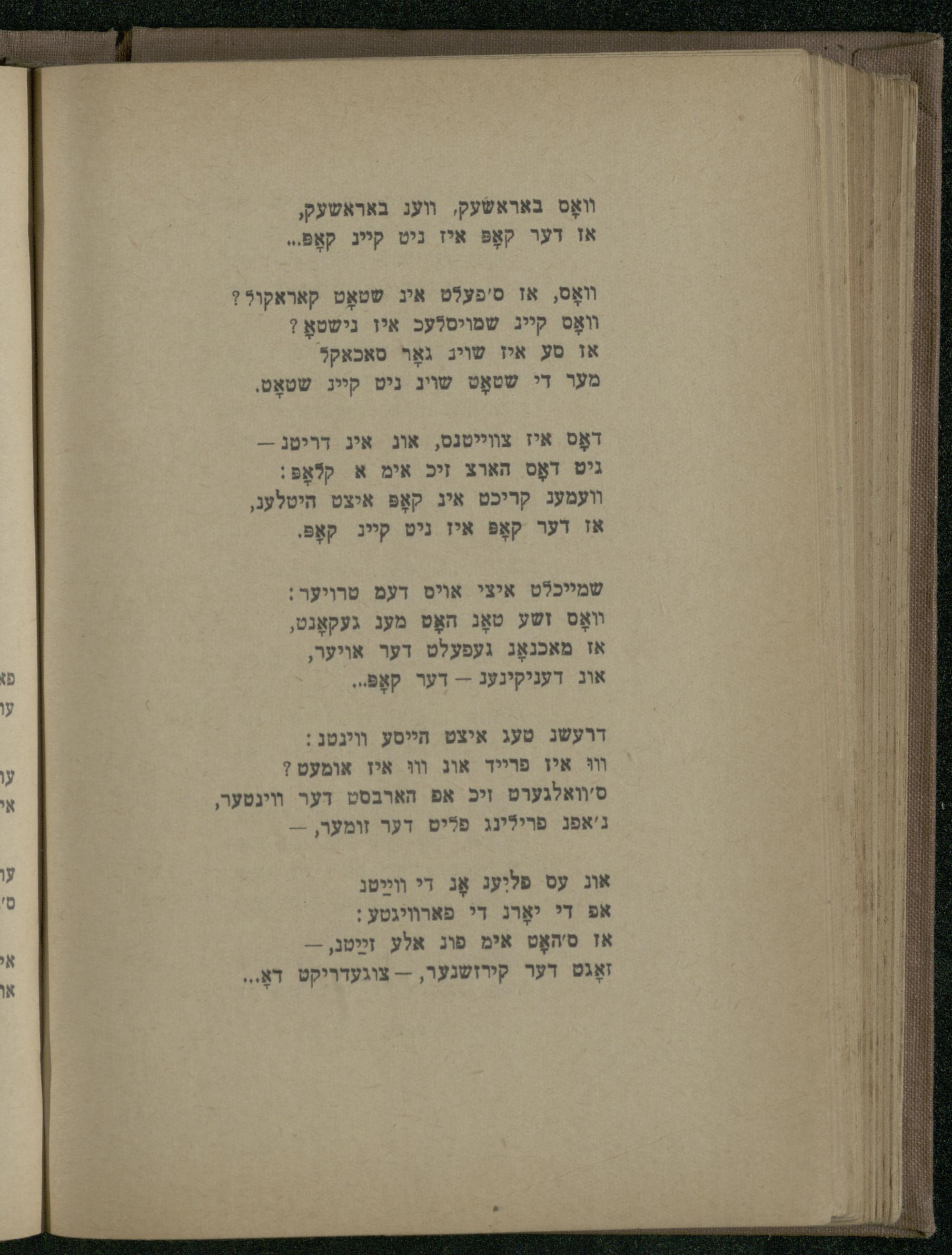 דועשנ טעג איצט הייסע װעטנ: װוּ איז פרייד אוג וו איז אומעט? ס'וואלגערט זיכ אפ הארבסט דער װינטער, נ'אפג פרילינג פליט דער זומער,-