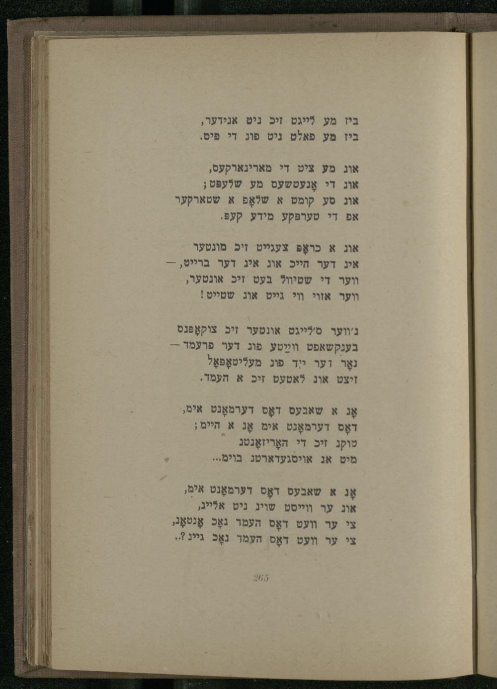 נ'ווער ס'לייגט אונטער זיכ צוקאָפּנס בענקשאפט װײַטע פוג דער פרעמד-נאָר דער ייד פוג מעליטאָפּאָל זיצט אונ לאטעט זיס א העמד.