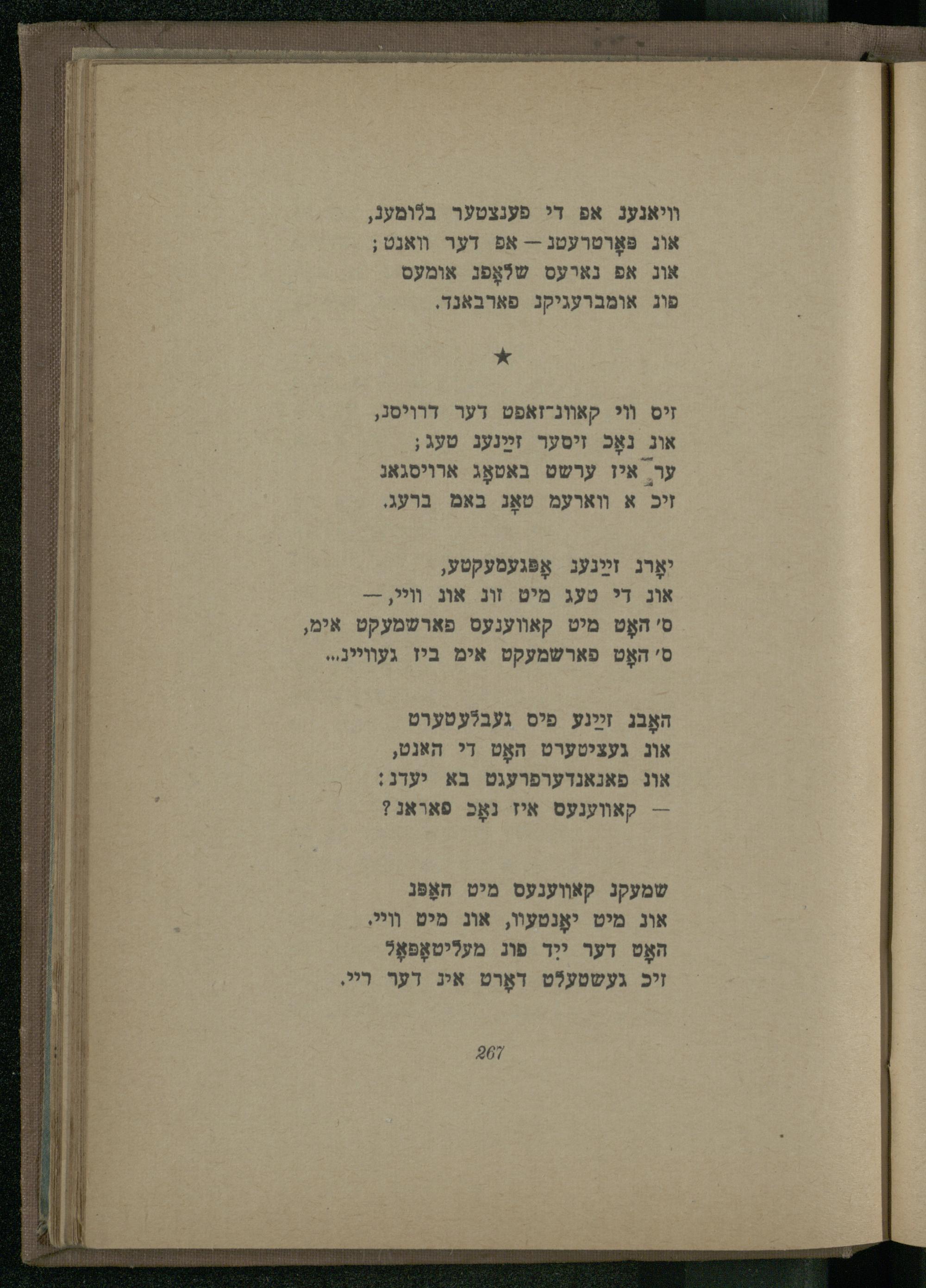 וויאנעג אפ די פענצטער בלומעגֿ, אוג פּאָוטרעטנ-- אפ דער ואנט; אוג אפ נארעס שלאָפג אומעס פוג אומברעגיקג פארבאנד.