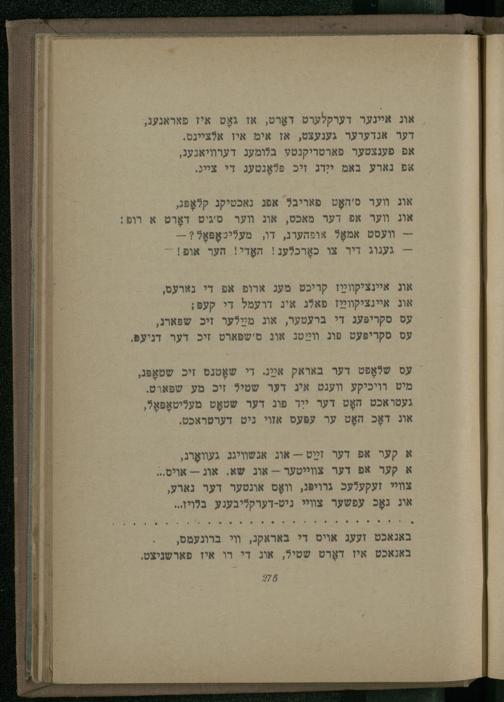 אונ נאָכ עפשער צוויי ניט-דערקליבענע בלויו... באנאכט זעעג אויס די באראקנ, וי ברוגעמס, באנאכט איז דאָרט שטיל, אוג די רו איז פארשניצט,