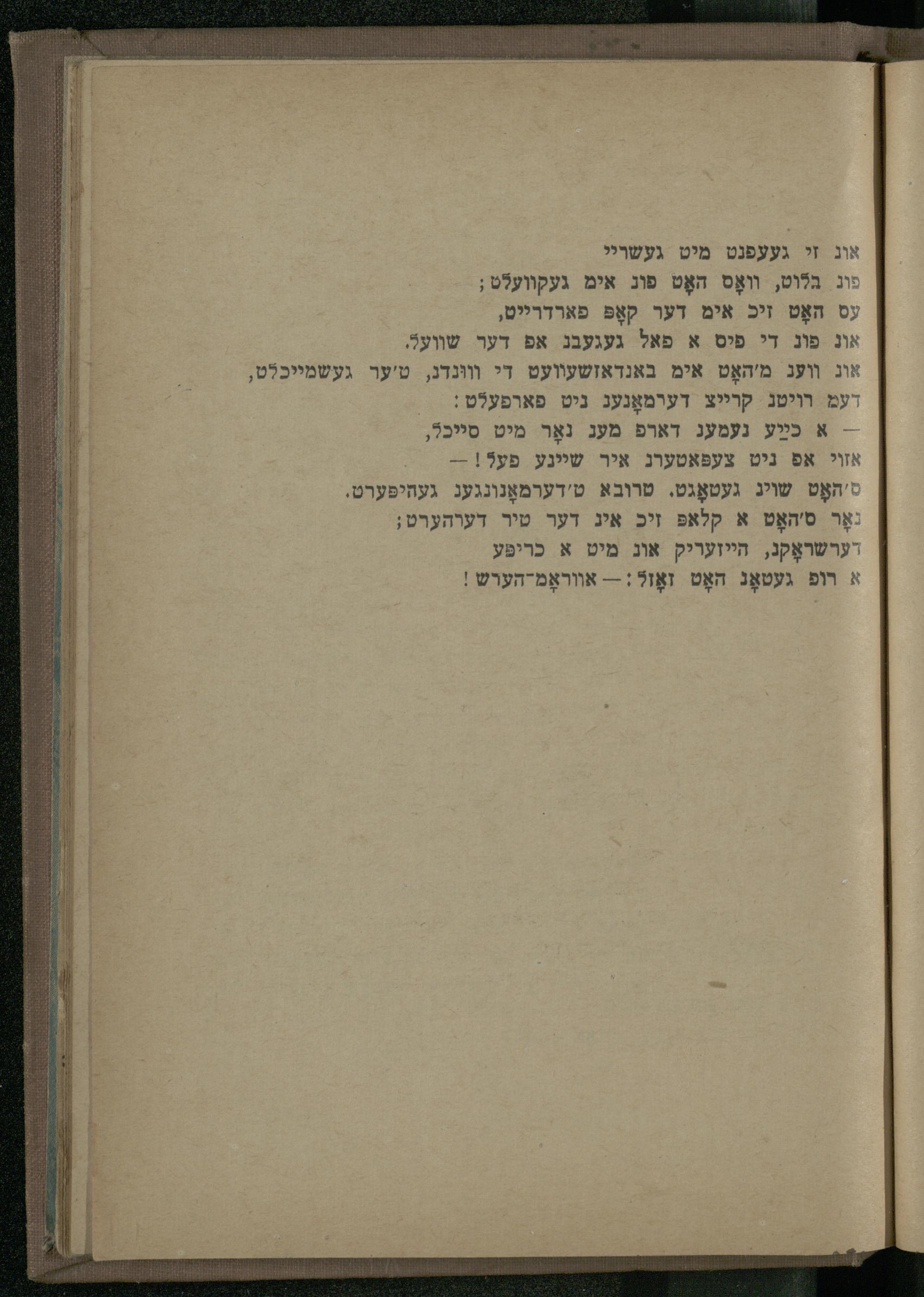 ס'האָט שוג געטאָגט. טרובא ט'דערמאָנונגעג געהיפּערט. נאָר ס'האָט א קלאפּ זיכ איג דער טיר דערהערט; דערשראָקג, הייזעריק אוג מיט א כריפע