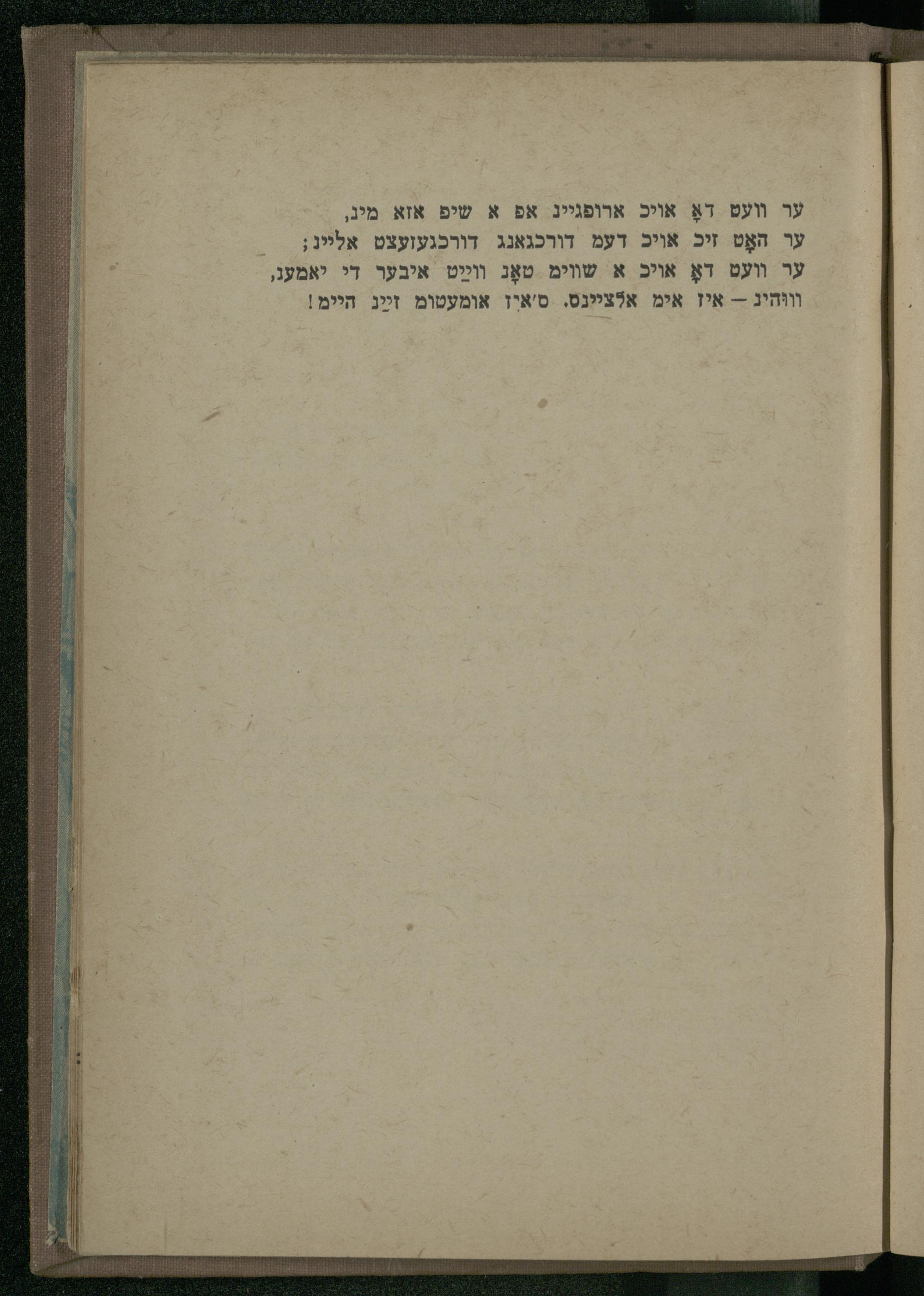 ער האָט זיכ אויכ דעמ דורכגאנג דורכגעזעצט אלייג; ער װעט דאָ אויכ א שווימ טאָג װײַט איבער די יאמעג, וװוּהיג-- איז אימ אלציינס. ס'איז אומעטומ זײַג היימ!