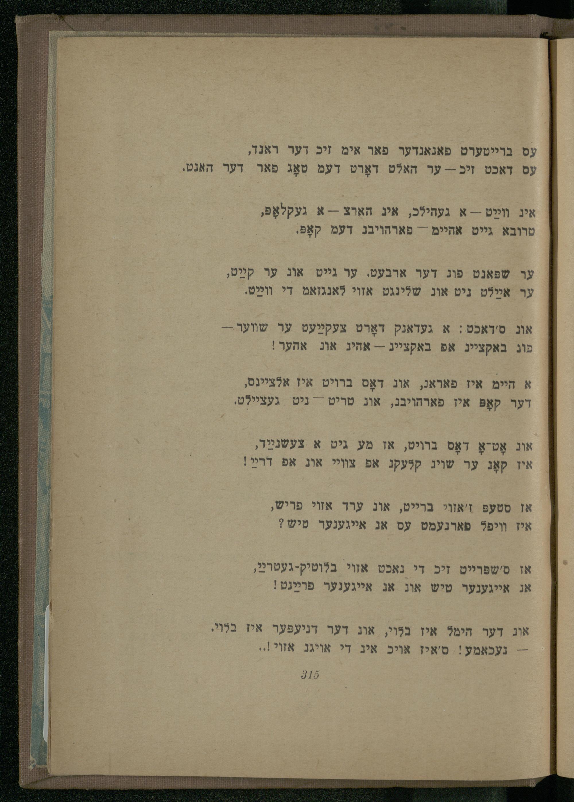 ער שפּאנט פוג דער ארבעט. ער גייט אונ ער קײַט, ער אײַלט ניט אונ שלינגט אזוי לאנגזאמ די װײַט.