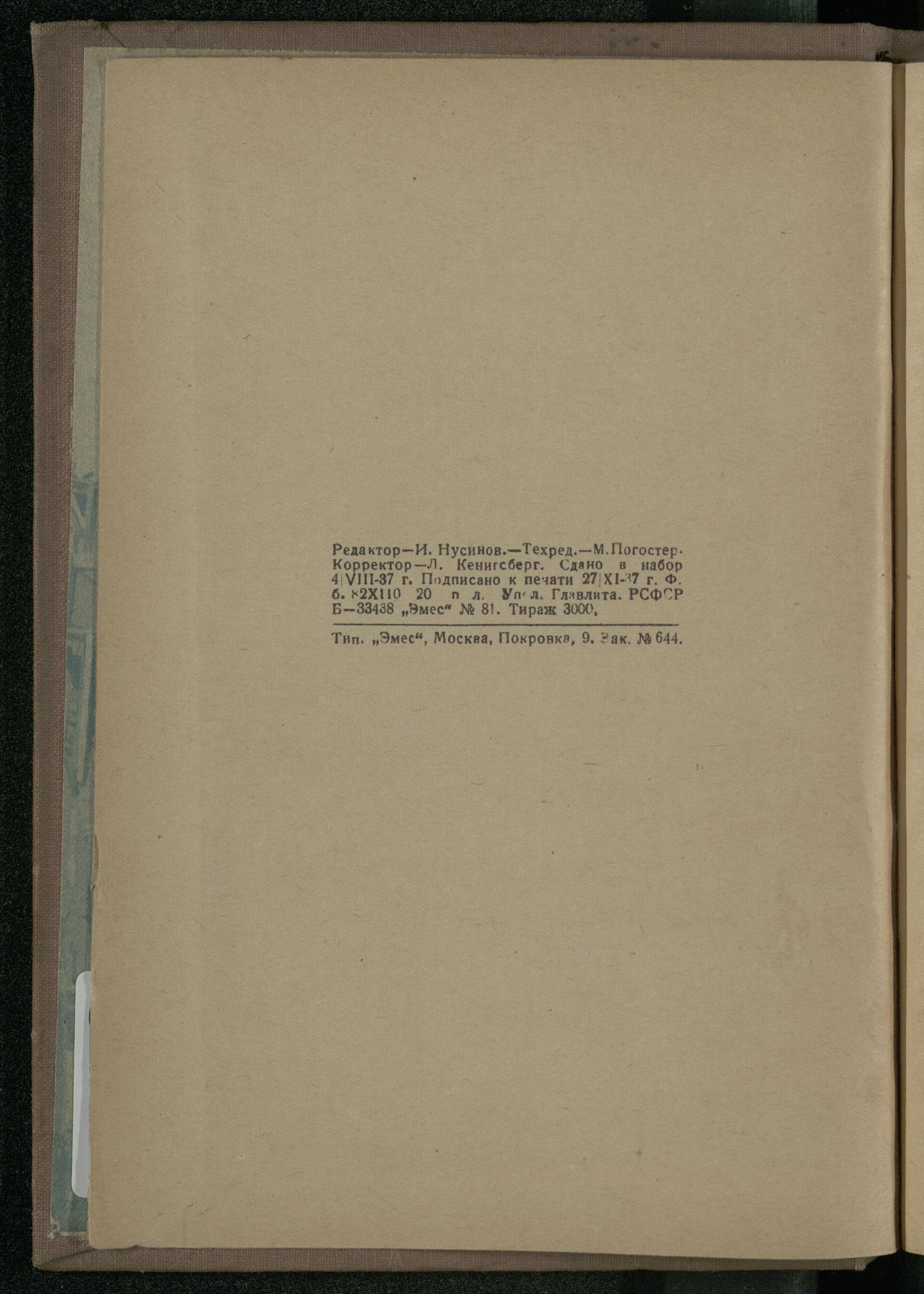 Редактор- И. Нусинов.- Техред.- М. Погостер. Корректор- Л. Кенигсберг. Сдано В набор 41-37 г. Подписано к печати 27 X1-37 г. Ф. 6. 82X110 20 П Л. Упл. Главлита. РСФСР Б- 33438" Эмес" № 81. Тираж 3000,