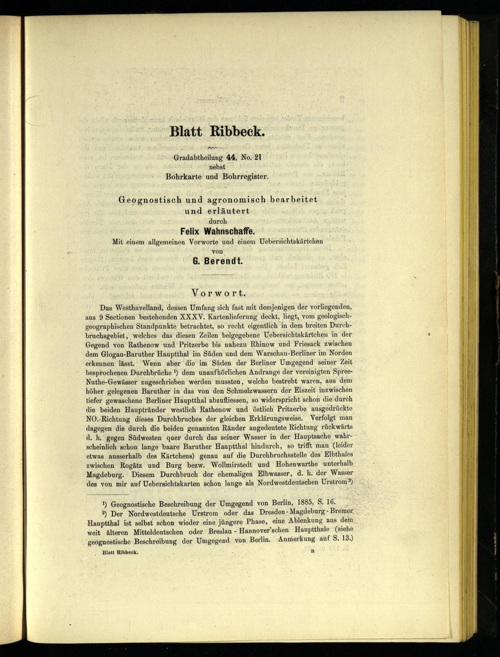 Das Westhavelland, dessen Umfang sieh fast mit demjenigen der vorliegenden, aus 9 Sectionen bestehenden XXXV. Kartenlieferung deckt, liegt, vom geologischgeographischen Standpunkte betrachtet, so recht eigentlich in dem breiten Durchbruchsgebiet, welches das diesen Zeilen beigegebene Uebersichtskärtchen in der Gegend von Rathenow und Pritzerbe bis nahezu Rhinow und Friesack zwischen dem Glogau-Baruther Hauptthal im Süden und dem Warschau-Berliner im Norden erkennen lässt. Wenn aber die im Süden der Berliner Umgegend seiner Zeit besprochenen Durchbrüche 1) dem unaufhörlichen Andrange der vereinigten Spree- Nuthe-Gewässer zugeschrieben werden mussten, welche bestrebt waren, aus dem höher gelegenen Baruther in das von den Schmelzwassern der Eiszeit inzwischen tiefer gewaschene Berliner Hauptthal abzufliessen, so widerspricht schon die durch die beiden Hauptränder westlich Rathenow und östlich Pritzerbe ausgedrückte NO.-Richtung dieses Durchbruches der gleichen Erklärungsweise. Verfolgt man dagegen die durch die beiden genannten Ränder angedeutete Richtung rückwärts d. h. gegen Südwesten quer durch das seiner Wasser in der Hauptsache wahrscheinlich schon lange baare Baruther Hauptthal hindurch, so trifft man (leider otwas ausserhalb des Kärtchens) genau auf die Durchbruchsstelle des Elbthales zwischen Rogätz und Burg bezw. Wollmirstedt und Hohenwarthe unterhalb Magdeburg. Diesem Durchbruch der ehemaligen Elbwasser, d. h. der Wasser des von mir auf Uebersichtskarten schon lange als Nord westdeutschen Urstrom) 2