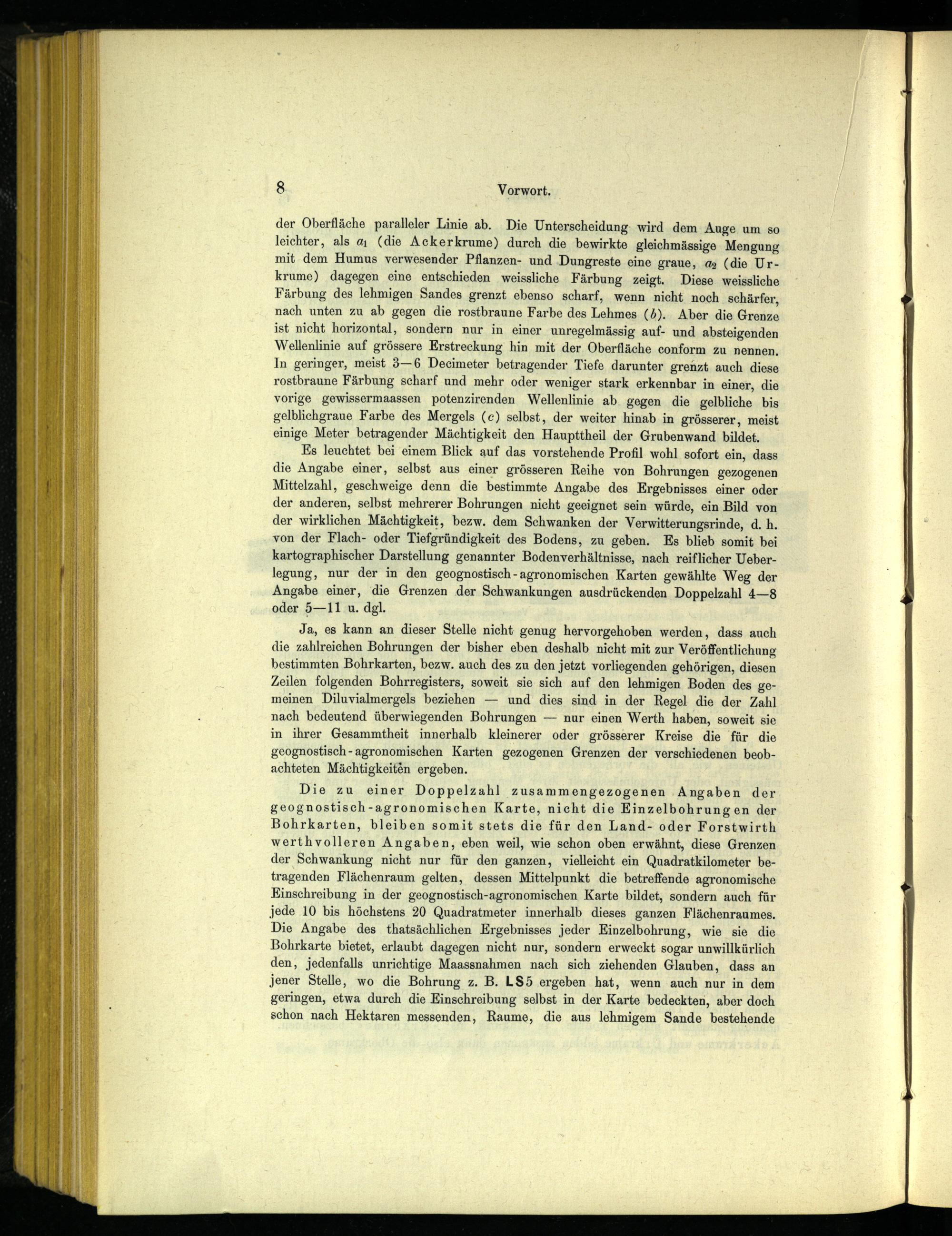 Die zu einer Doppelzahl zusammengezogenen Angaben der geognostisch-agronomischen Karte, nicht die Einzelbohrungen der Bohrkarten, bleiben somit stets die für den Land- oder Forstwirth werthvolleren Angaben, eben weil, wie schon oben erwähnt, diese Grenzen der Schwankung nicht nur für den ganzen, vielleicht ein Quadratkilometer betragenden Flächenraum gelten, dessen Mittelpunkt die betreffende agronomische Einschreibung in der geognostisch-agronomischen Karte bildet, sondern auch für jede 10 bis höchstens 20 Quadratmeter innerhalb dieses ganzen Flächenraumes. Die Angabe des thatsächlichen Ergebnisses jeder Einzelbohrung, wie sie die Bohrkarte bietet, erlaubt dagegen nicht nur, sondern erweckt sogar unwillkürlich den, jedenfalls unrichtige Maassnahmen nach sich ziehenden Glauben, dass an jener Stelle, wo die Bohrung z. B. LS5 ergeben hat, wenn auch nur in dem geringen, etwa durch die Einschreibung selbst in der Karte bedeckten, aber doch schon nach Hektaren messenden, Raume, die aus lehmigem Sande bestehende