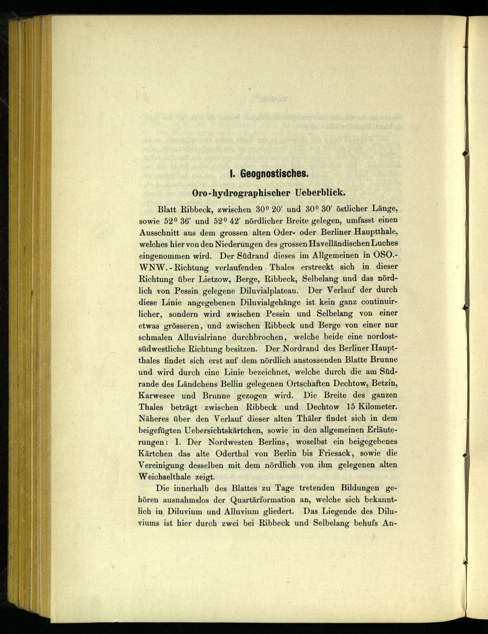 Blatt Ribbeck , zwischen 30° 20’ und 30° 30’ östlicher Länge, sowie 52° 36’ und 52° 42’ nördlicher Breite gelegen, umfasst einen Ausschnitt aus dem grossen alten Oder- oder Berliner Hauptthale, welches hier von den Niederungen des grossen Havelländischen Luches eingenommen wird. Der Südrand dieses im Allgemeinen in OSO.- WNW. - Richtung verlaufenden Thaies erstreckt sich in dieser Richtung über Lietzow, Berge, Ribbeck , Selbelang und das nördlich von Pessin gelegene Diluvialplateau. Der Verlauf der durch diese Linie angegebenen Diluvialgehänge ist kein ganz continuir- licher, sondern wird zwischen Pessin und Selbelang von einer etwas grösseren, und zwischen Ribbeck und Berge von einer nur schmalen Alluvialrinne durchbrochen, welche beide eine nordostsüdwestliche Richtung besitzen. Der Nordrand des Berliner Hauptthaies findet sich erst auf dem nördlich anstossenden Blatte Brunne und wird durch eine Linie bezeichnet, welche durch die am Südrande des Ländchens Bellin gelegenen Ortschaften Dechtow, Betzin, Karwesee und Brunne gezogen wird. Die Breite des ganzen Thaies beträgt zwischen Ribbeck und Dechtow 15 Kilometer. Näheres über den Verlauf dieser alten Thäler findet sich in dem beigefügten Uebersichtskärtchen, sowie in den allgemeinen Erläuterungen: I. Der Nordwesten Berlins , woselbst ein beigegebenes Kärtchen das alte Oderthal von Berlin bis Friesack , sowie die Vereinigung desselben mit dem nördlich von ihm gelegenen alten Weichselthaie zeigt.