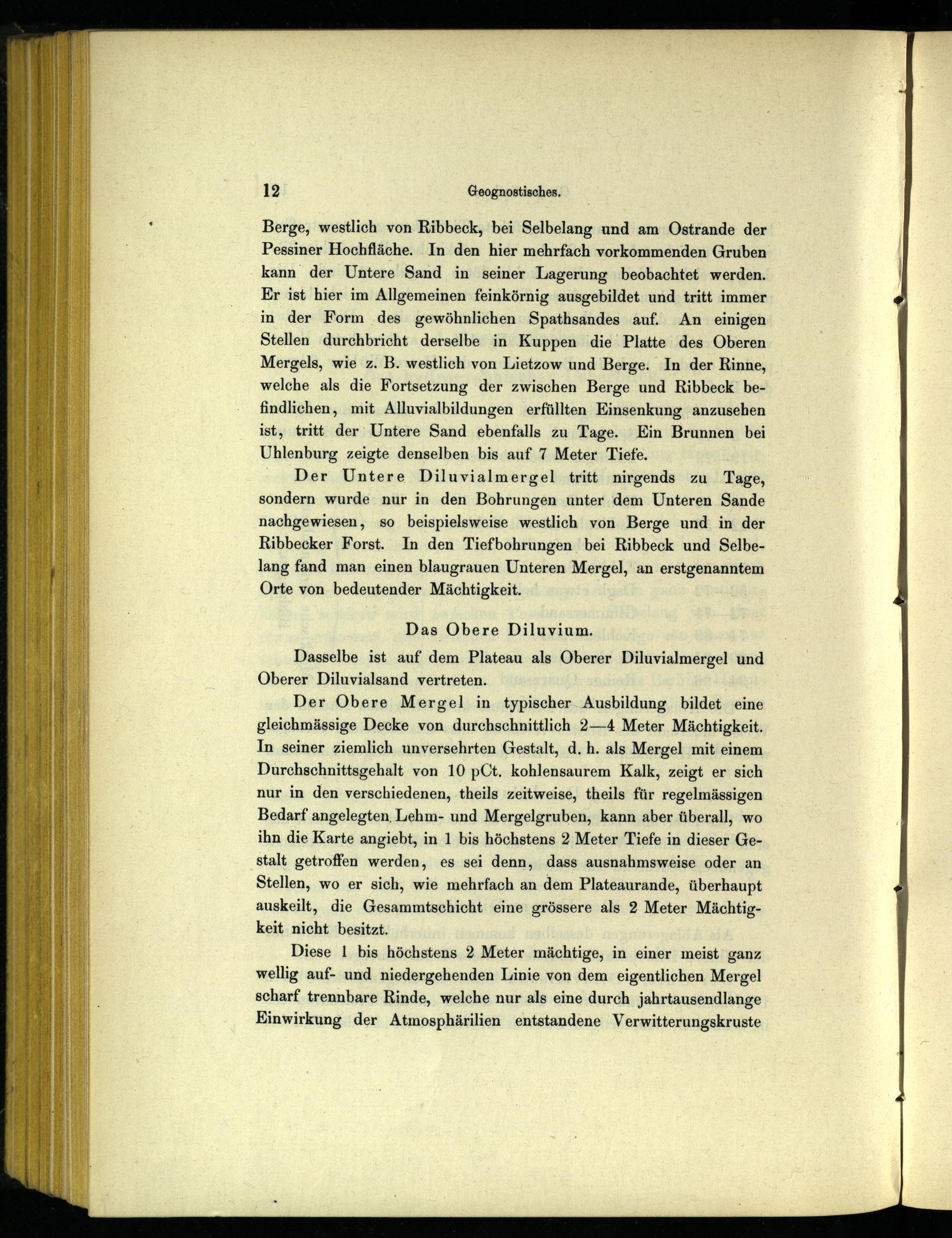 Berge, westlich von Ribbeck , bei Selbelang und am Ostrande der Pessiner Hochfläche. In den hier mehrfach vorkommenden Gruben kann der Untere Sand in seiner Lagerung beobachtet werden. Er ist hier im Allgemeinen feinkörnig ausgebildet und tritt immer in der Form des gewöhnlichen Spathsandes auf. An einigen Stellen durchbricht derselbe in Kuppen die Platte des Oberen Mergels, wie z. B. westlich von Lietzow und Berge. In der Rinne, welche als die Fortsetzung der zwischen Berge und Ribbeck befindlichen, mit Alluvialbildungen erfüllten Einsenkung anzusehen ist, tritt der Untere Sand ebenfalls zu Tage. Ein Brunnen bei Uhlenburg zeigte denselben bis auf 7 Meter Tiefe.