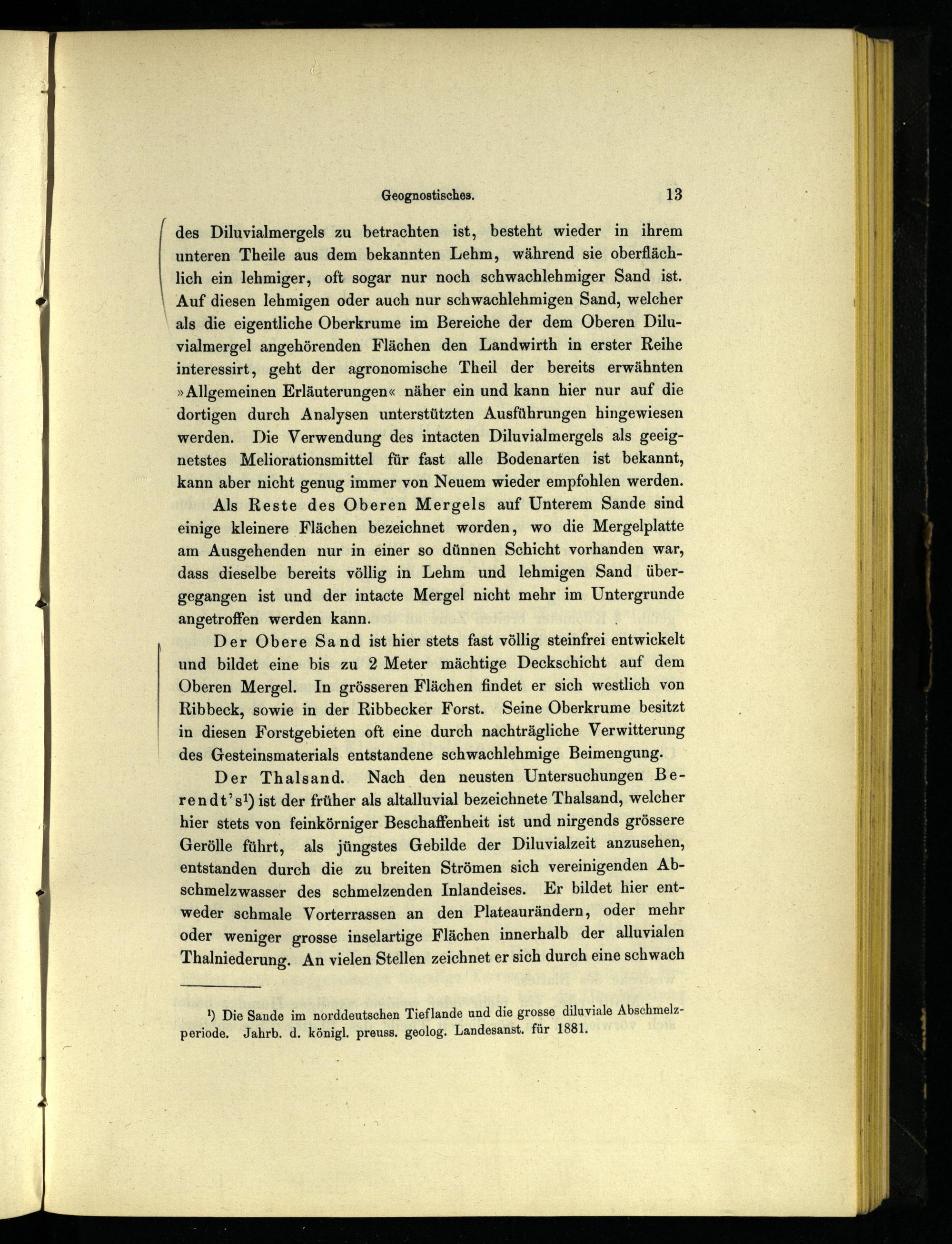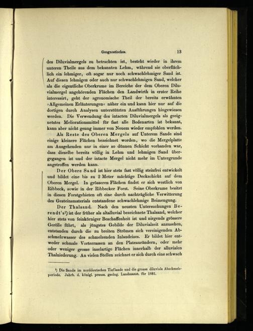 des Diluvialmergels zu betrachten ist, besteht wieder in ihrem unteren Theile aus dem bekannten Lehm, während sie oberflächlich ein lehmiger, oft sogar nur noch schwachlehmiger Sand ist. Auf diesen lehmigen oder auch nur schwachlehmigen Sand, welcher als die eigentliche Oberkrume im Bereiche der dem Oberen Diluvialmergel angehörenden Flächen den Landwirth in erster Reihe interessirt, geht der agronomische Theil der bereits erwähnten »Allgemeinen Erläuterungen« näher ein und kann hier nur auf die dortigen durch Analysen unterstützten Ausführungen hingewiesen werden. Die Verwendung des intacten Diluvialmergels als geeignetstes Meliorationsmittel für fast alle Bodenarten ist bekannt, kann aber nicht genug immer von Neuem wieder empfohlen werden.