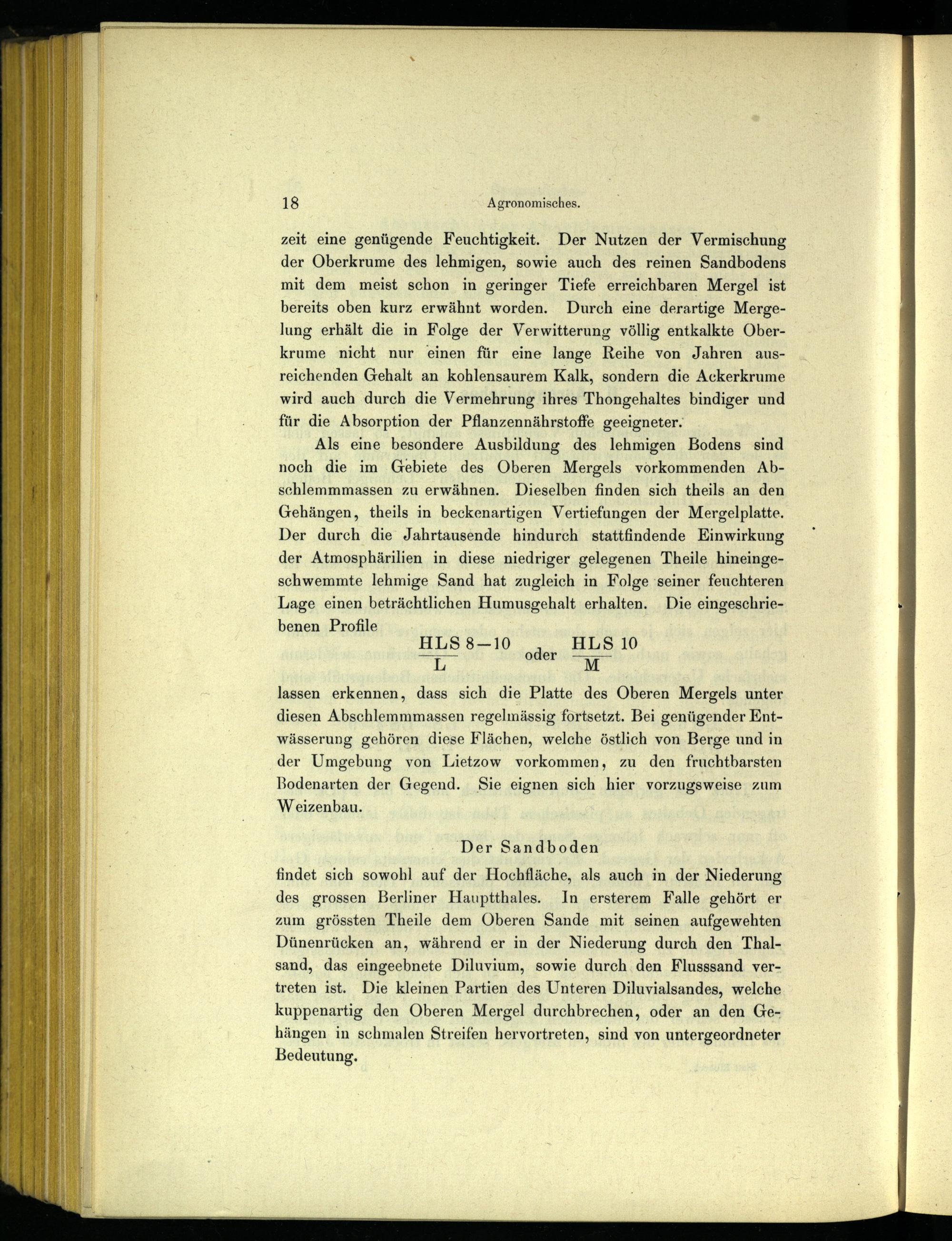zeit eine genügende Feuchtigkeit. Der Nutzen der Vermischung der Oberkrume des lehmigen, sowie auch des reinen Sandbodens mit dem meist schon in geringer Tiefe erreichbaren Mergel ist bereits oben kurz erwähnt worden. Durch eine derartige Merge- lung erhält die in Folge der Verwitterung völlig entkalkte Oberkrume nicht nur einen für eine lange Reihe von Jahren ausreichenden Gehalt an kohlensaurem Kalk, sondern die Ackerkrume wird auch durch die Vermehrung ihres Thongehaltes bindiger und für die Absorption der Pflanzennährstoffe geeigneter.