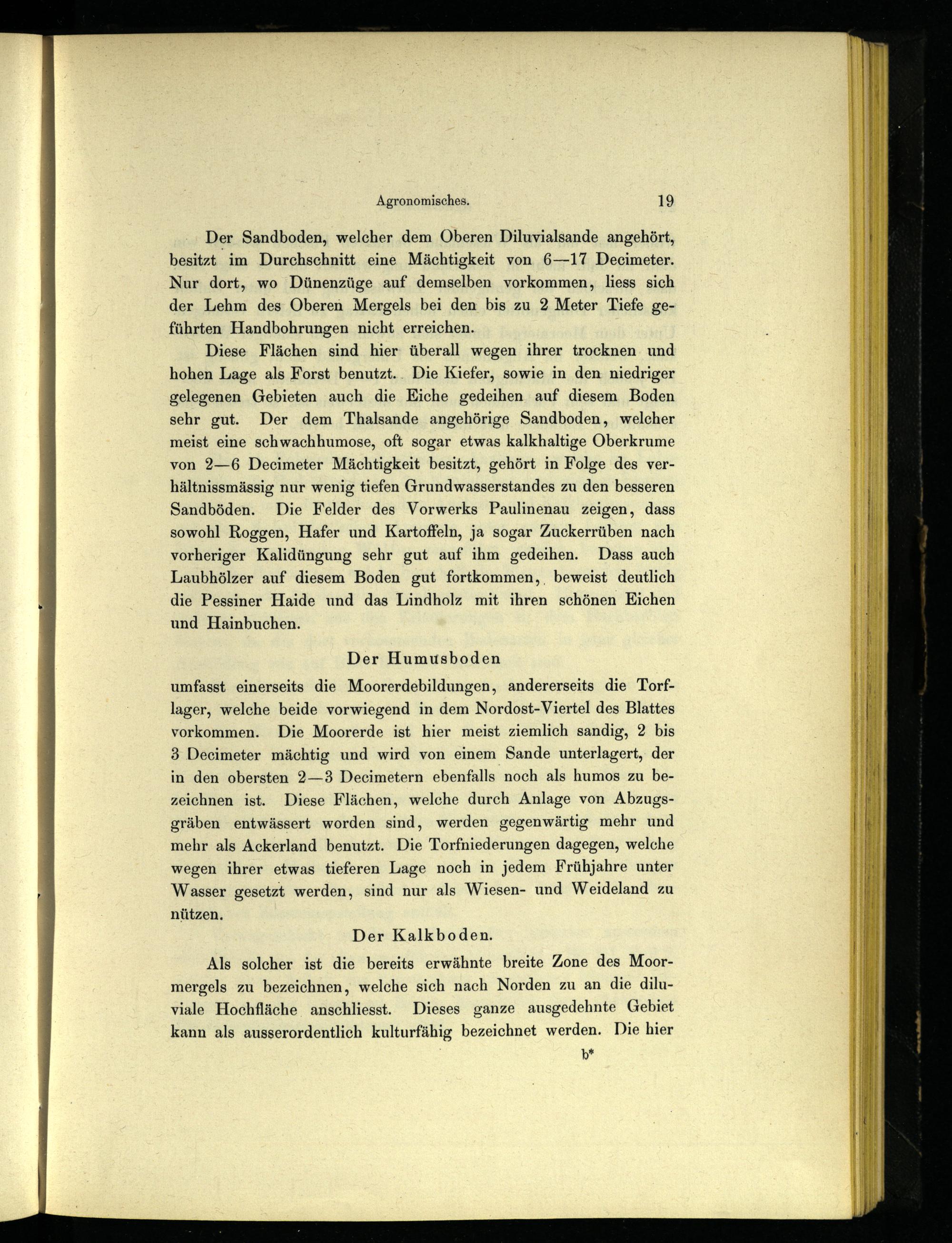 Diese Flächen sind hier überall wegen ihrer trocknen und hohen Lage als Forst benutzt. Die Kiefer, sowie in den niedriger gelegenen Gebieten auch die Eiche gedeihen auf diesem Boden sehr gut. Der dem Thalsande angehörige Sandboden, welcher meist eine schwachhumose, oft sogar etwas kalkhaltige Oberkrume von 2—6 Decimeter Mächtigkeit besitzt, gehört in Folge des ver- hältnissmässig nur wenig tiefen Grundwasserstandes zu den besseren Sandböden. Die Felder des Vorwerks Paulinenau zeigen, dass sowohl Roggen, Hafer und Kartoffeln, ja sogar Zuckerrüben nach vorheriger Kalidüngung sehr gut auf ihm gedeihen. Dass auch Laubhölzer auf diesem Boden gut fortkommen, beweist deutlich die Pessiner Haide und das Lindholz mit ihren schönen Eichen und Hainbuchen.